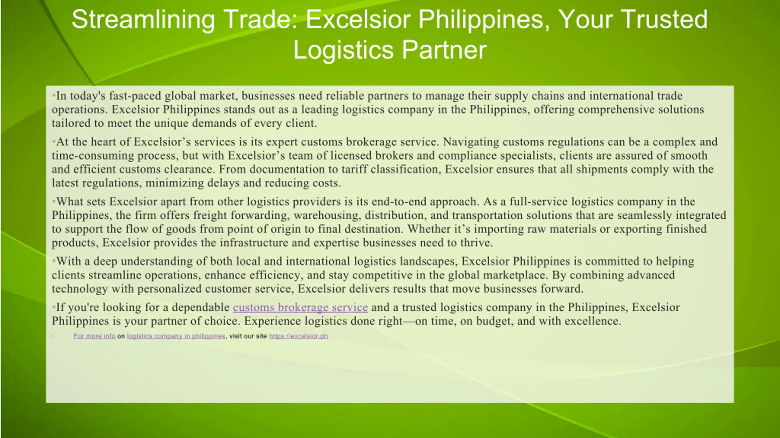 If you're looking for a dependable customs brokerage service and a trusted logistics company in the Philippines, Excelsior Philippines is your partner of choice. Experience logistics done rightu2014on time, on budget, and with excellence.nFor more