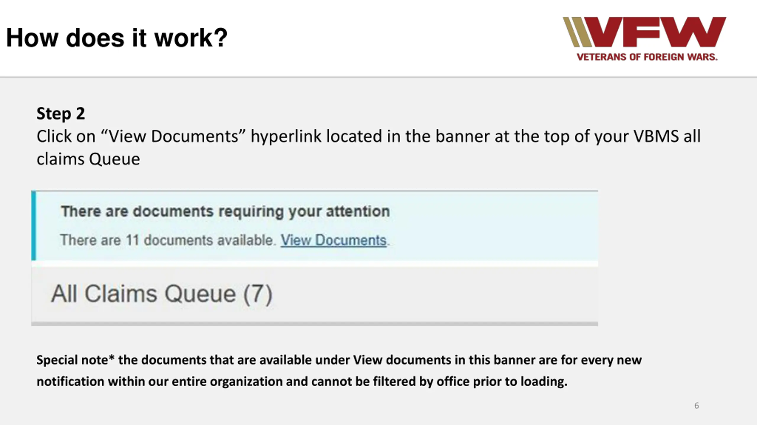 How does it work? Step 2 Click on View Documents hyperlink located in the banner at the top of your VBMS all claims Queue Special note* the documents that are available under View documents in this banner are for every new notification within our entire organization and cannot be filtered by office prior to loading. 6