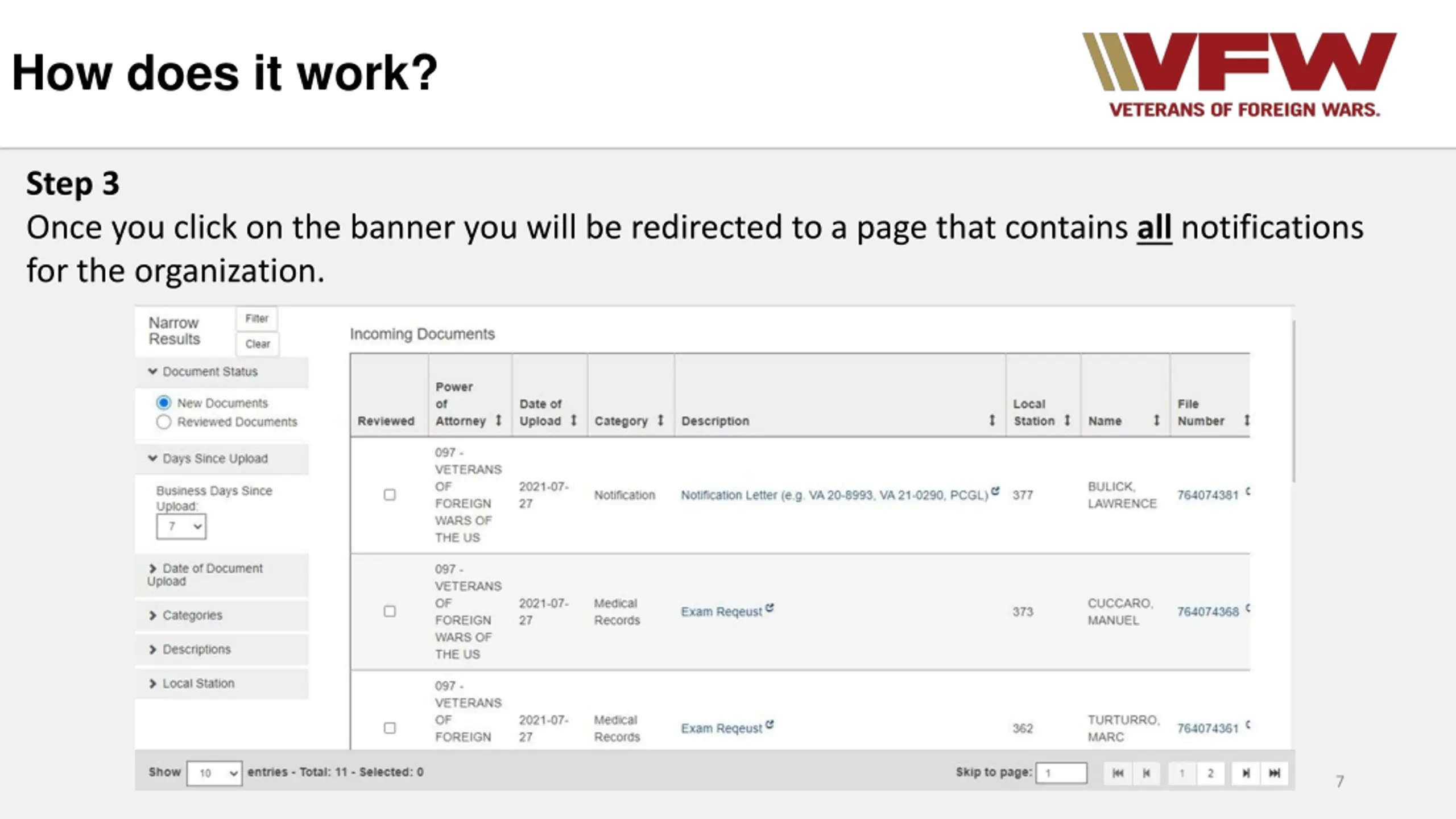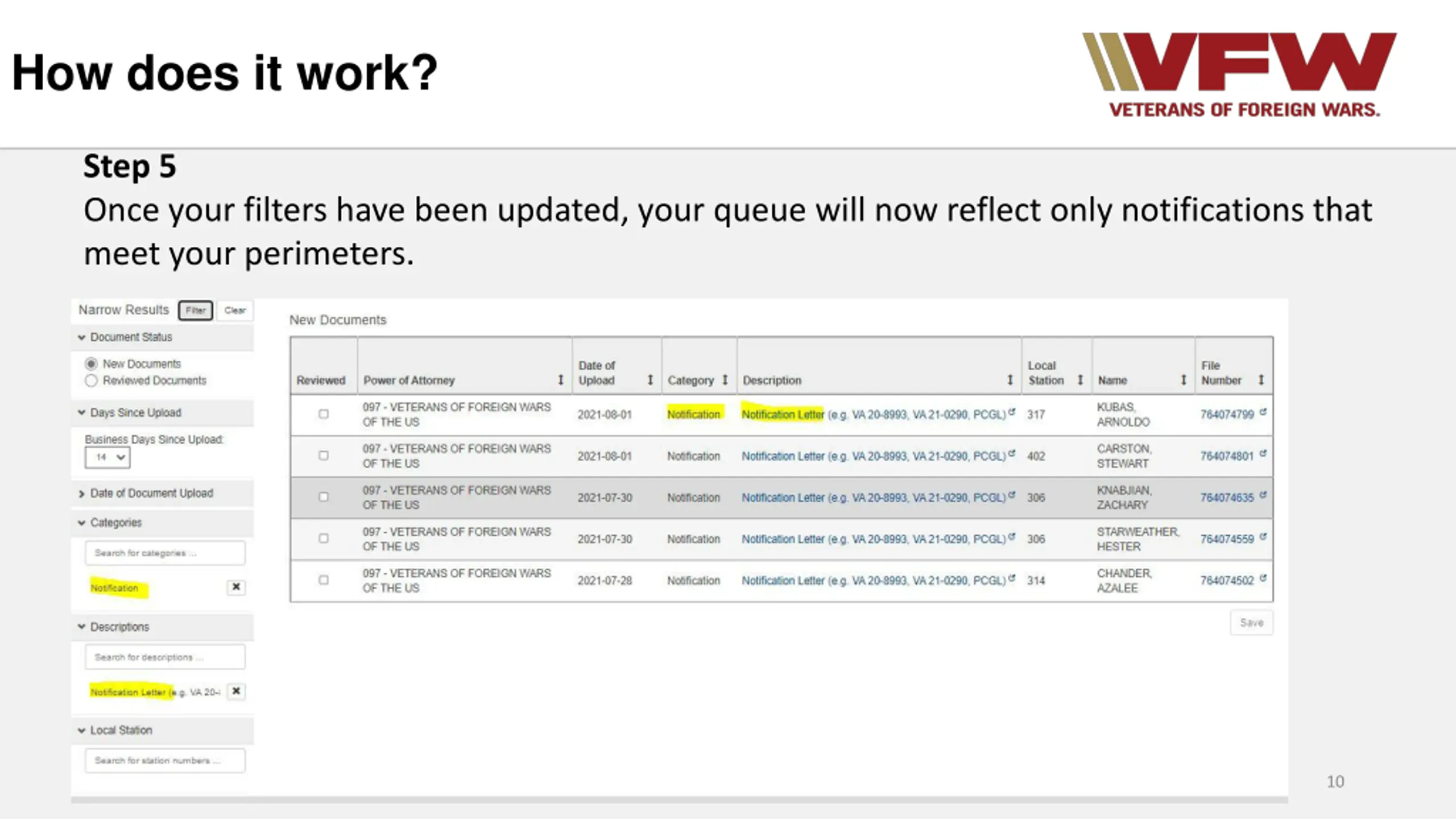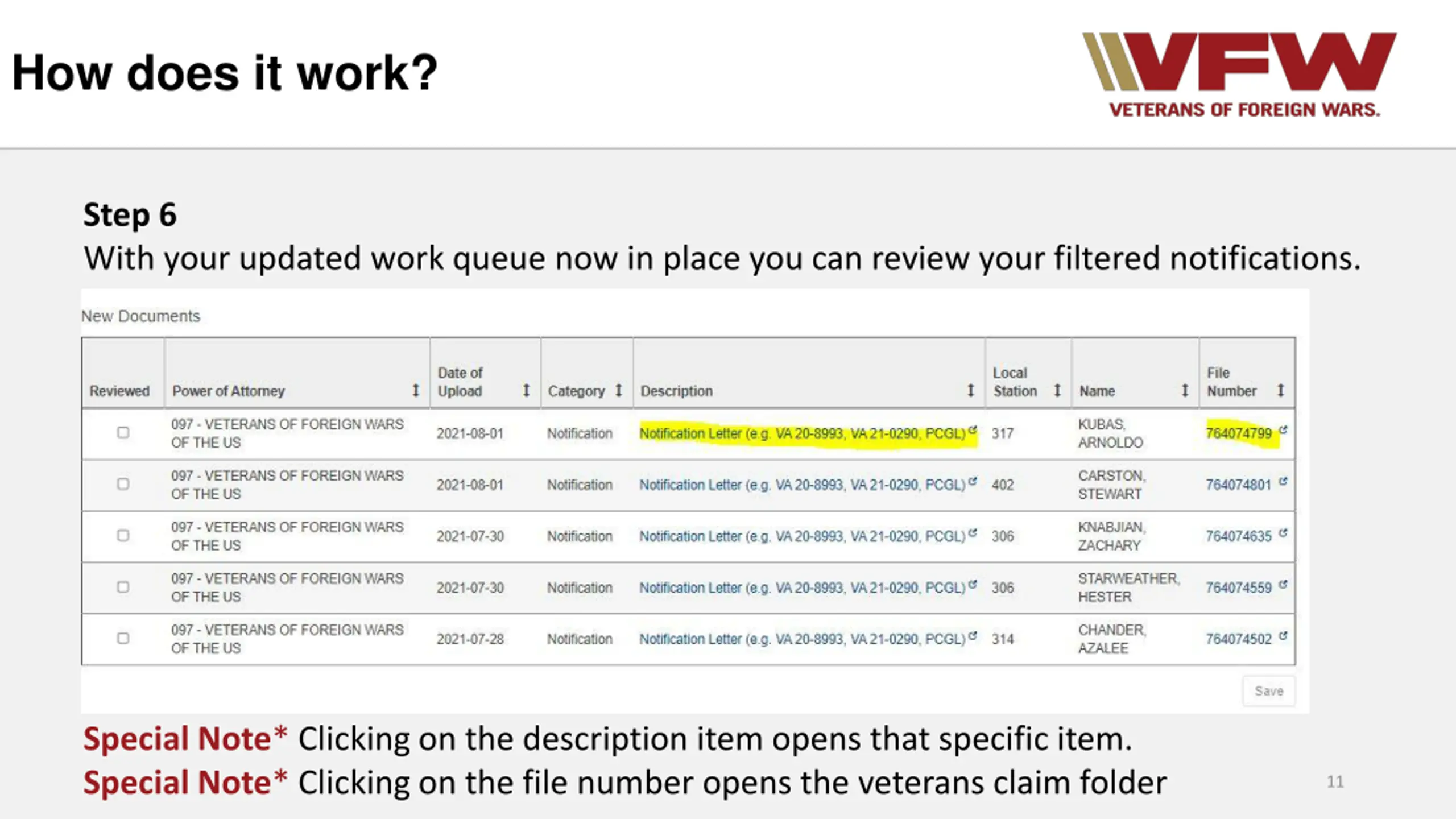How does it work? Step 6 With your updated work queue now in place you can review your filtered notifications. Special Note* Clicking on the description item opens that specific item. Special Note* Clicking on the file number opens the veterans claim folder 11