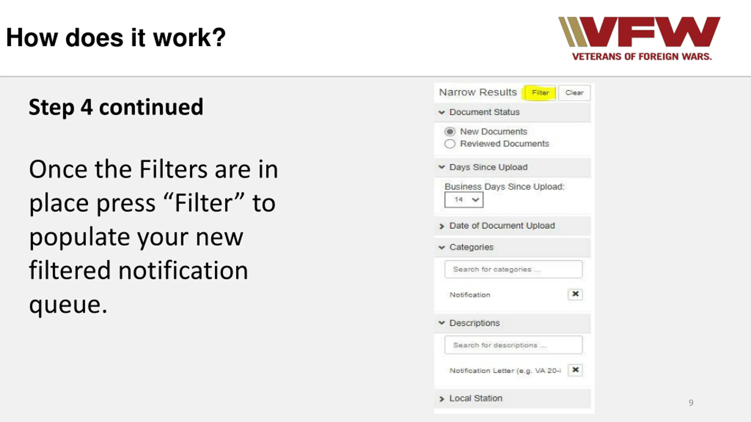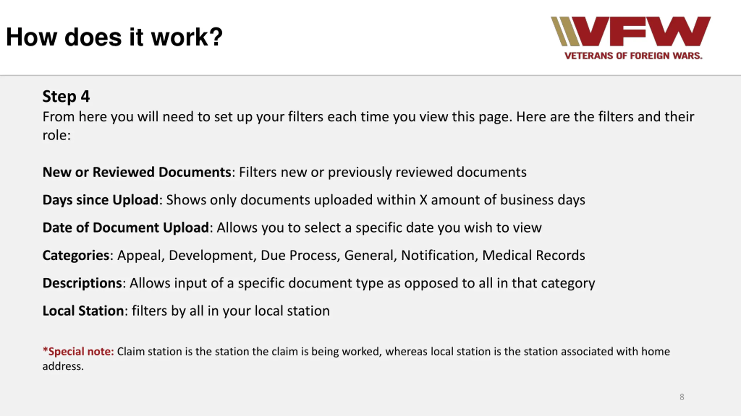 How does it work? Step 4 From here you will need to set up your filters each time you view this page. Here are the filters and their role: New or Reviewed Documents: Filters new or previously reviewed documents Days since Upload: Shows only documents uploaded within X amount of business days Date of Document Upload: Allows you to select a specific date you wish to view Categories: Appeal, Development, Due Process, General, Notification, Medical Records Descriptions: Allows input of a specific document type as opposed to all in that category Local Station: filters by all in your local station *Special note: Claim station is the station the claim is being worked, whereas local station is the station associated with home address. 8