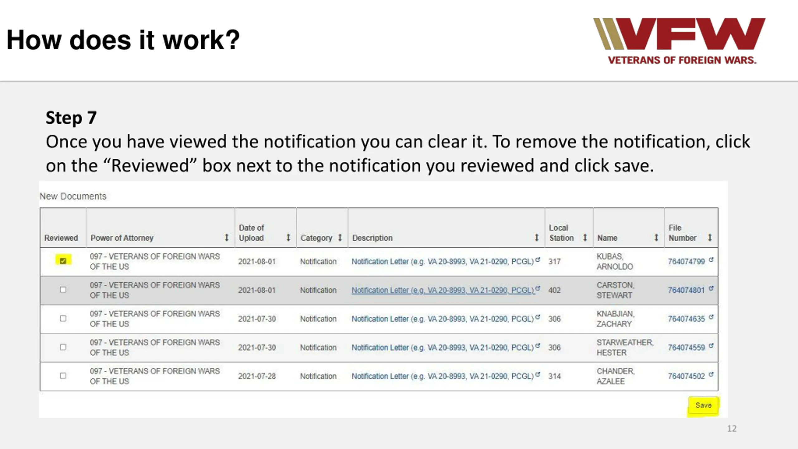 How does it work? Step 7 Once you have viewed the notification you can clear it. To remove the notification, click on the Reviewed box next to the notification you reviewed and click save. 12