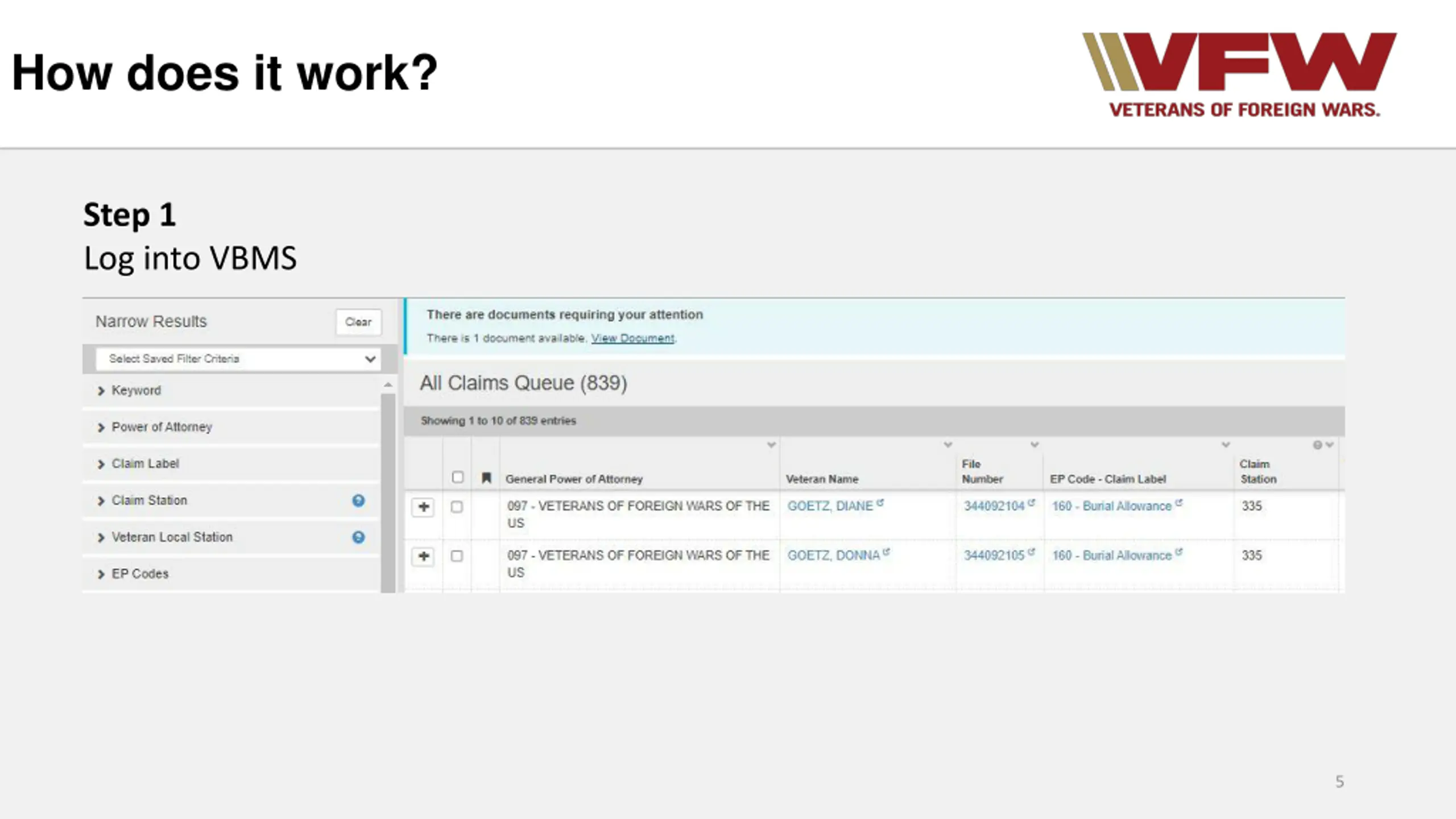 How does it work? Step 1 Log into VBMS 5