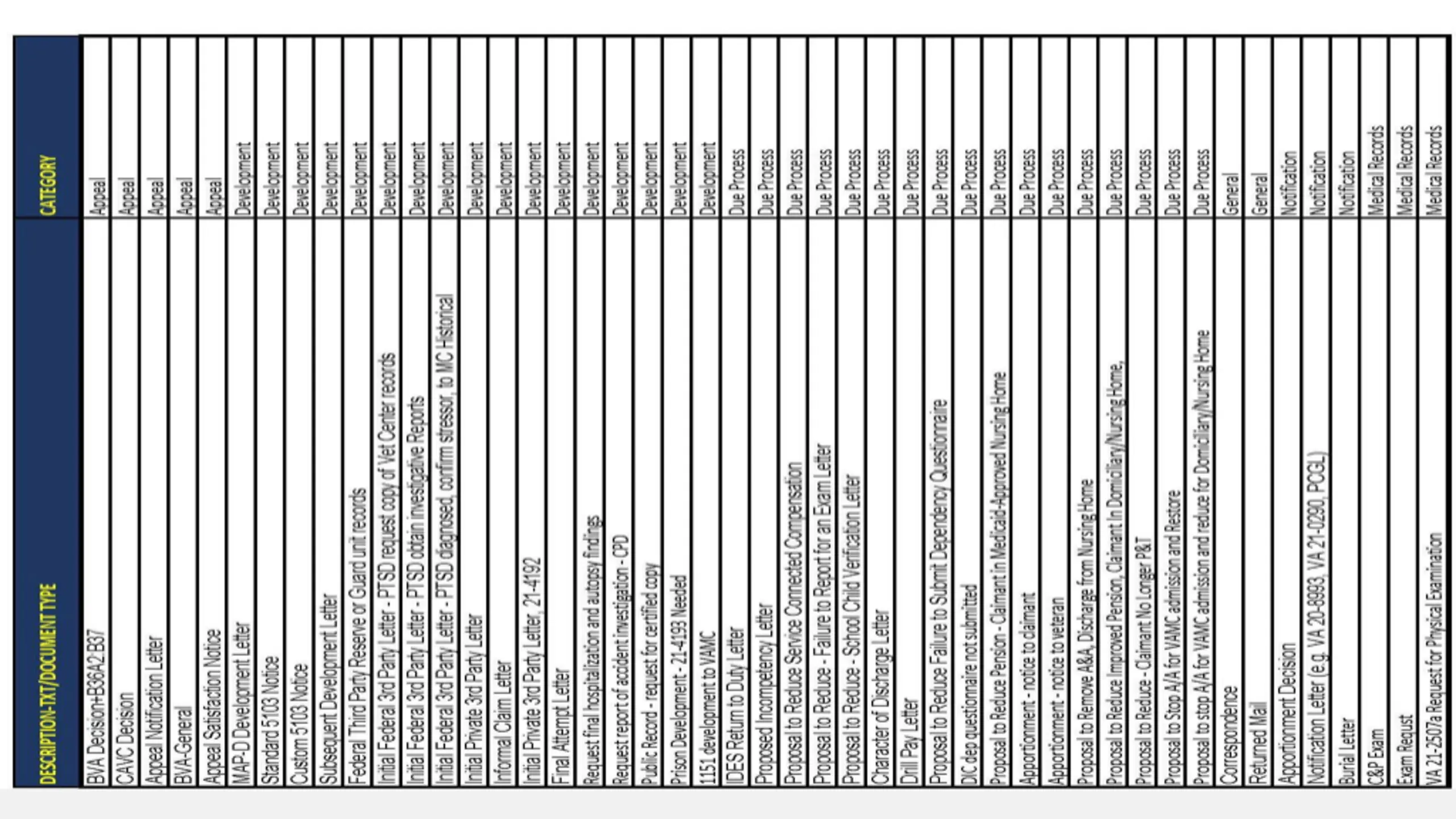 The 6 Categories of notification The Notification Process allows you to choose to be notified for one or more categories of VA Notifications. There are 6 categories, and they are: Appeal Development Due Process General Notification Medical Records 3