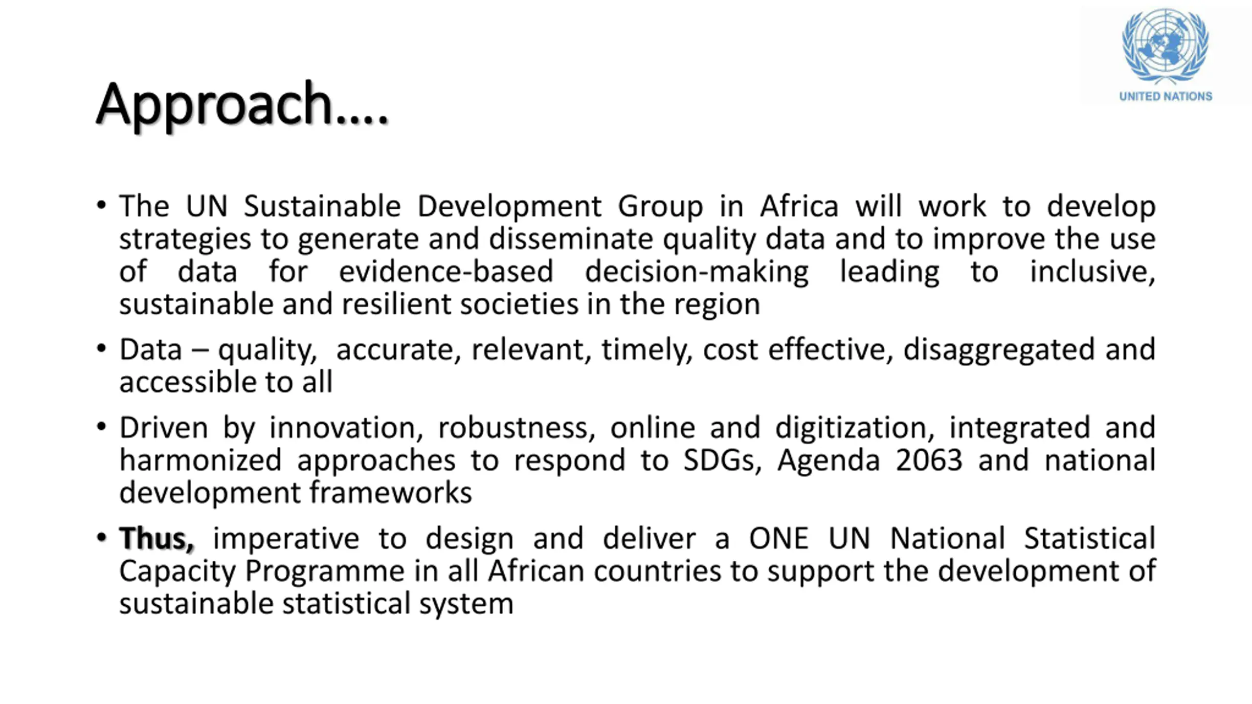 Approach. Approach . The UN Sustainable Development Group in Africa will work to develop strategies to generate and disseminate quality data and to improve the use of data for evidence-based decision-making leading to inclusive, sustainable and resilient societies in the region Data quality, accurate, relevant, timely, cost effective, disaggregated and accessible to all Driven by innovation, robustness, online and digitization, integrated and harmonized approaches to respond to SDGs, Agenda 2063 and national development frameworks Thus, imperative to design and deliver a ONE UN National Statistical Capacity Programme in all African countries to support the development of sustainable statistical system