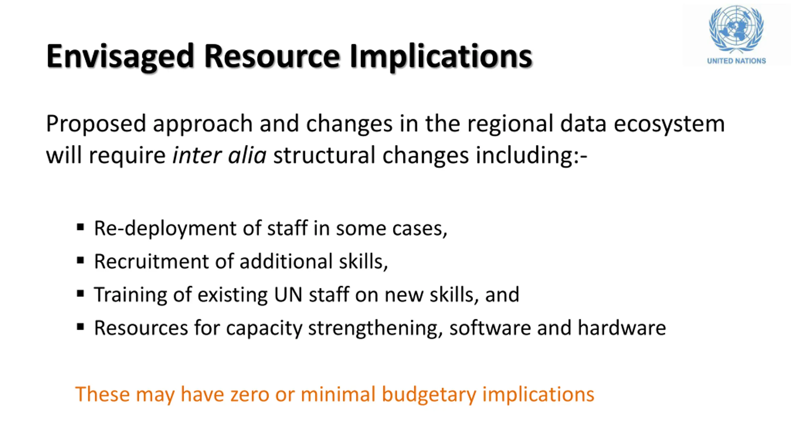 Envisaged Resource Implications Proposed approach and changes in the regional data ecosystem will require inter alia structural changes including:- Re-deployment of staff in some cases, Recruitment of additional skills, Training of existing UN staff on new skills, and Resources for capacity strengthening, software and hardware These may have zero or minimal budgetary implications
