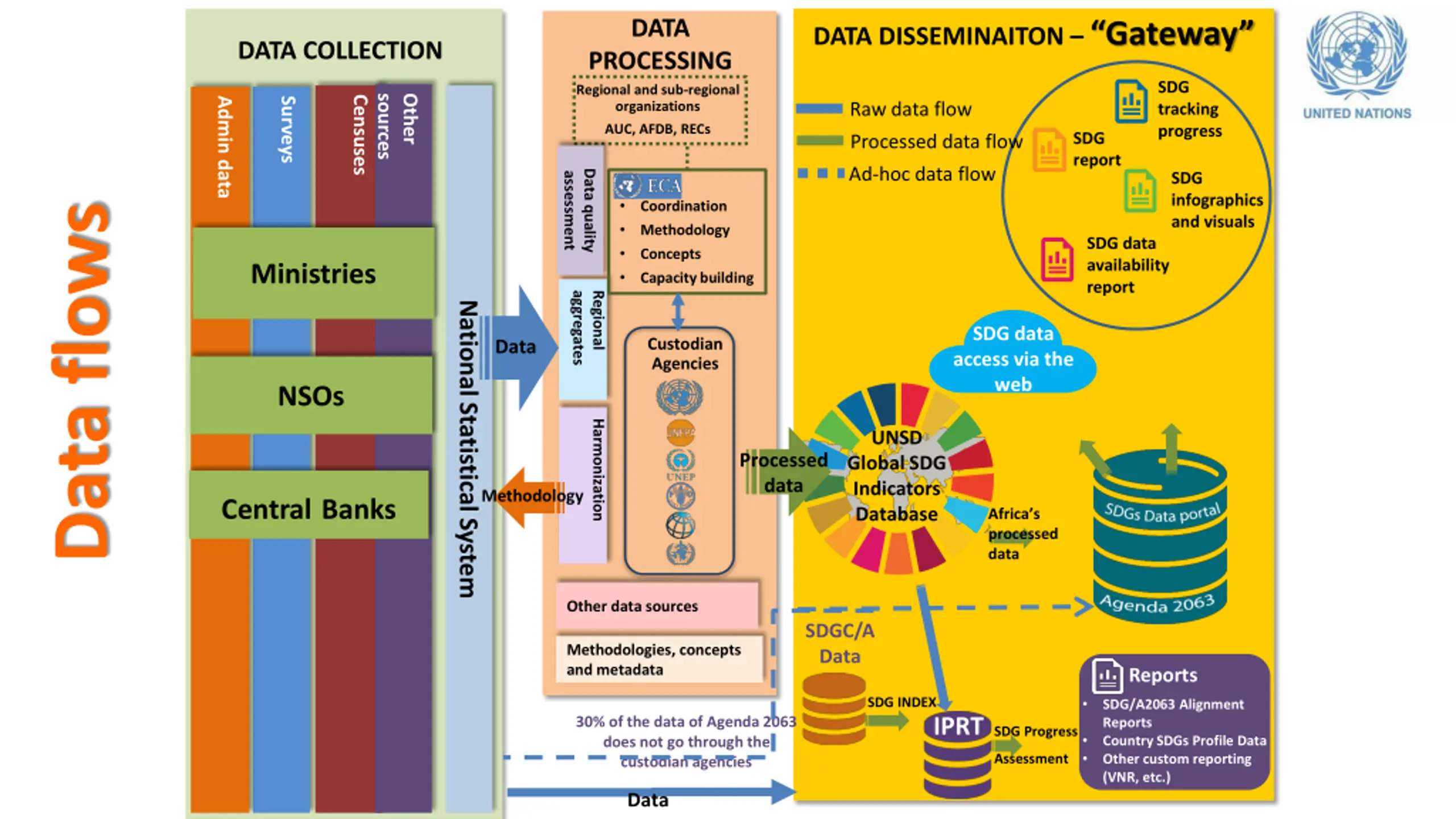 DATA DATA DISSEMINAITON Gateway DATA COLLECTION PROCESSING Regional and sub-regional organizations SDG tracking progress sources Other Censuses Admindata Surveys Raw data flow AUC, AFDB, RECs SDG report Processed data flow Ad-hoc data flow Data quality SDG infographics and visuals assessment Data flows Coordination Methodology Concepts Capacity building SDG data availability report Ministries aggregates Regional National Statistical System SDG data access via the web Custodian Agencies Data NSOs Harmonization UNSD Global SDG Indicators Database Processed data CentralBanks Methodology Africa s processed data Other data sources SDGC/A Data Methodologies, concepts and metadata Reports SDG INDEX SDG/A2063 Alignment Reports Country SDGs Profile Data Other custom reporting (VNR, etc.) IPRT 30% of the data of Agenda 2063 does not go through the custodian agencies SDG Progress Assessment Data
