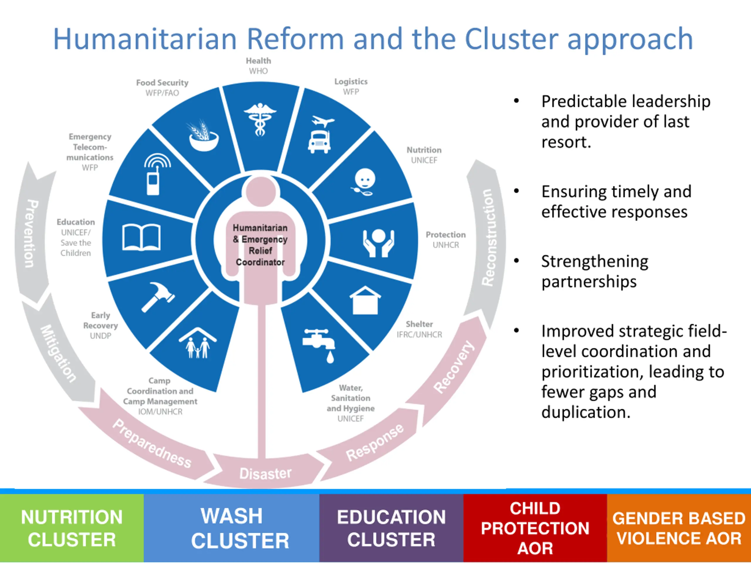 Humanitarian Reform and the Cluster approach Predictable leadership and provider of last resort. Ensuring timely and effective responses Strengthening partnerships Improved strategic field- level coordination and prioritization, leading to fewer gaps and duplication. CHILD WASH CLUSTER NUTRITION CLUSTER EDUCATION CLUSTER GENDER BASED VIOLENCE AOR PROTECTION AOR
