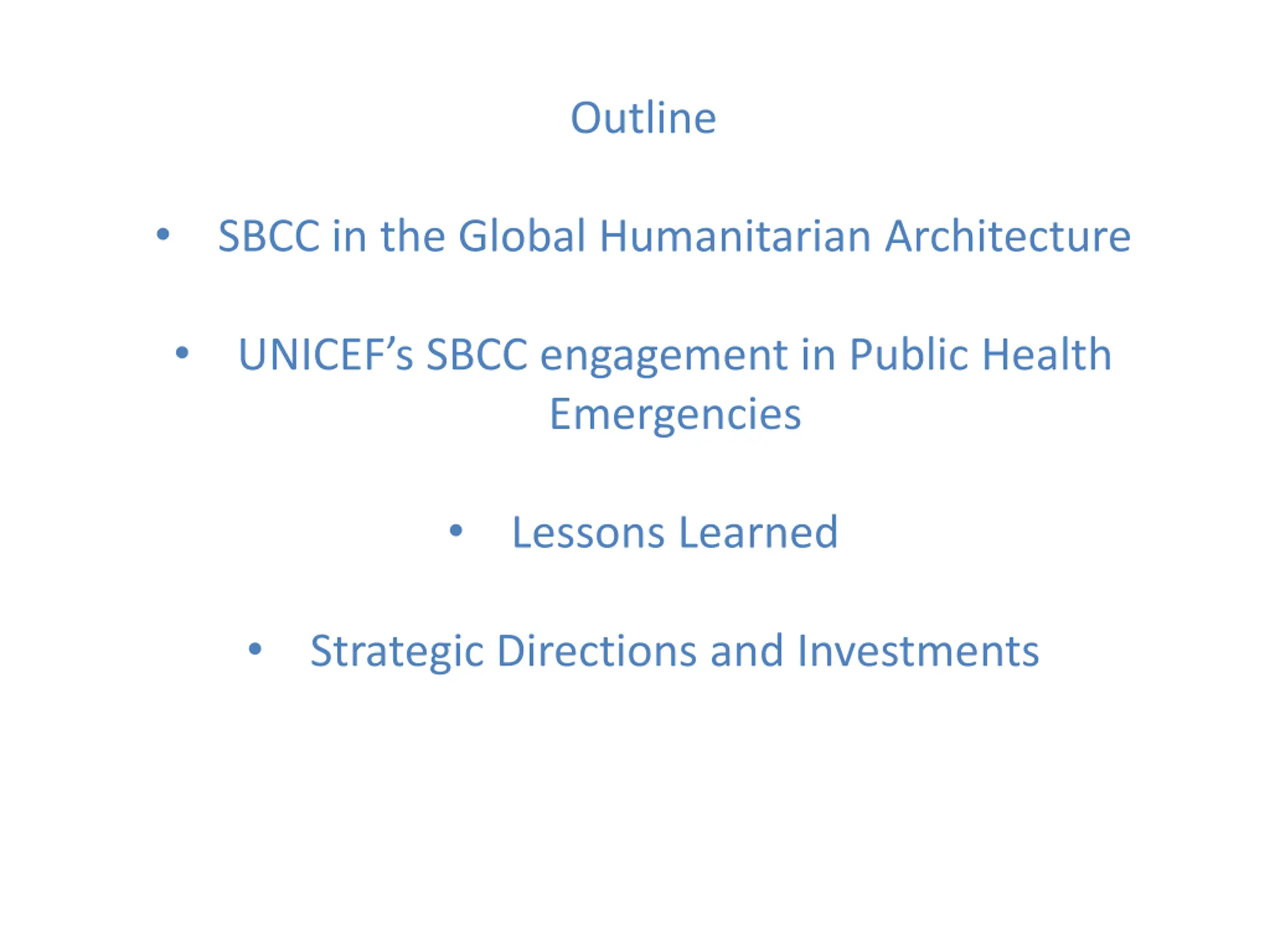 Outline SBCC in the Global Humanitarian Architecture UNICEF s SBCC engagement in Public Health Emergencies Lessons Learned Strategic Directions and Investments