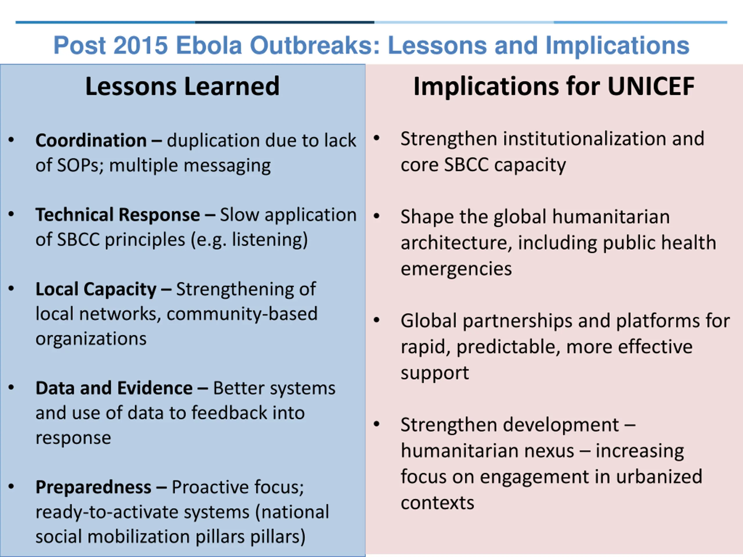 Post 2015 Ebola Outbreaks: Lessons and Implications Lessons Learned Implications for UNICEF Strengthen institutionalization and core SBCC capacity Coordination duplication due to lack of SOPs; multiple messaging Technical Response Slowapplication of SBCC principles (e.g. listening) Shape the global humanitarian architecture, including public health emergencies Local Capacity Strengthening of local networks, community-based organizations Global partnerships and platforms for rapid, predictable, more effective support Data and Evidence Better systems and use of data to feedback into response Strengthen development humanitarian nexus increasing focus on engagement in urbanized contexts Preparedness Proactive focus; ready-to-activate systems (national social mobilization pillars pillars)