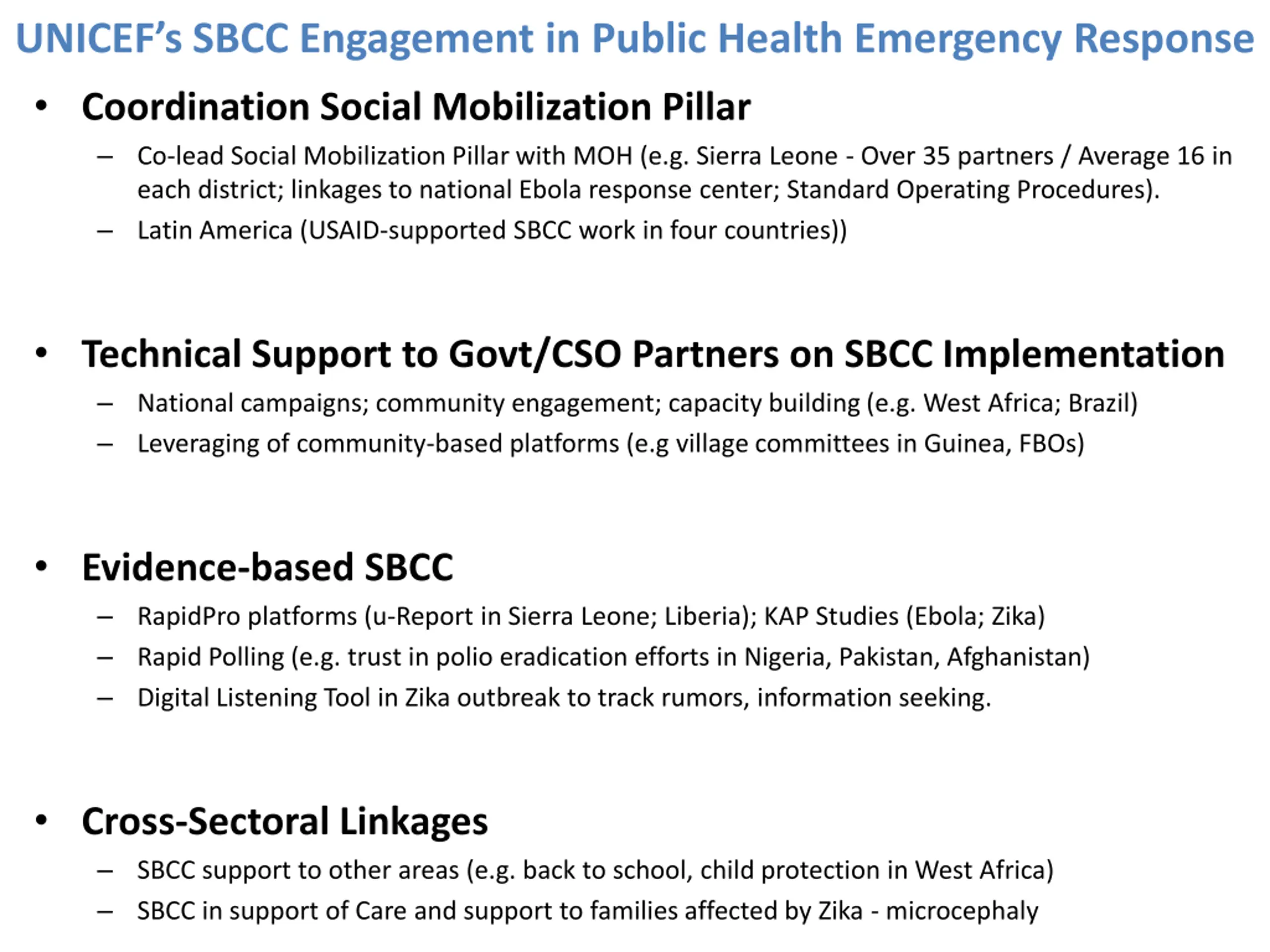 UNICEFs SBCC Engagement in Public Health Emergency Response Coordination Social Mobilization Pillar Co-lead Social Mobilization Pillar with MOH (e.g. Sierra Leone - Over 35 partners / Average 16 in each district; linkages to national Ebola response center; Standard Operating Procedures). Latin America (USAID-supported SBCC work in four countries)) Technical Support to Govt/CSO Partners on SBCC Implementation National campaigns; community engagement; capacity building (e.g. West Africa; Brazil) Leveraging of community-based platforms (e.g village committees in Guinea, FBOs) Evidence-based SBCC RapidPro platforms (u-Report in Sierra Leone; Liberia); KAP Studies (Ebola; Zika) Rapid Polling (e.g. trust in polio eradication efforts in Nigeria, Pakistan, Afghanistan) Digital Listening Tool in Zika outbreak to track rumors, information seeking. Cross-Sectoral Linkages SBCC support to other areas (e.g. back to school, child protection in West Africa) SBCC in support of Care and support to families affected by Zika - microcephaly
