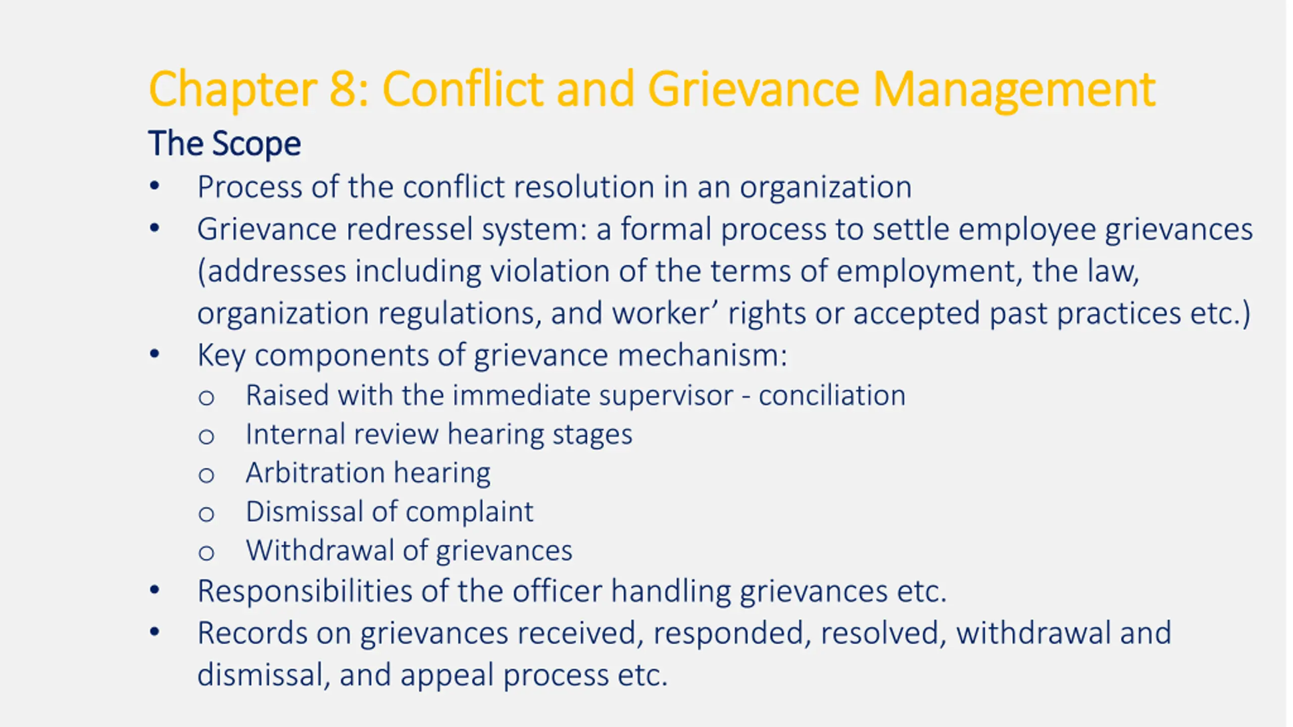Chapter 8: Conflict and Grievance Management Chapter 8: Conflict and Grievance Management The Scope The Scope Process of the conflict resolution in an organization Grievance redressel system: a formal process to settle employee grievances (addresses including violation of the terms of employment, the law, organization regulations, and worker rights or accepted past practices etc.) Key components of grievance mechanism: o Raised with the immediate supervisor - conciliation o Internal review hearing stages o Arbitration hearing o Dismissal of complaint o Withdrawal of grievances Responsibilities of the officer handling grievances etc. Records on grievances received, responded, resolved, withdrawal and dismissal, and appeal process etc.