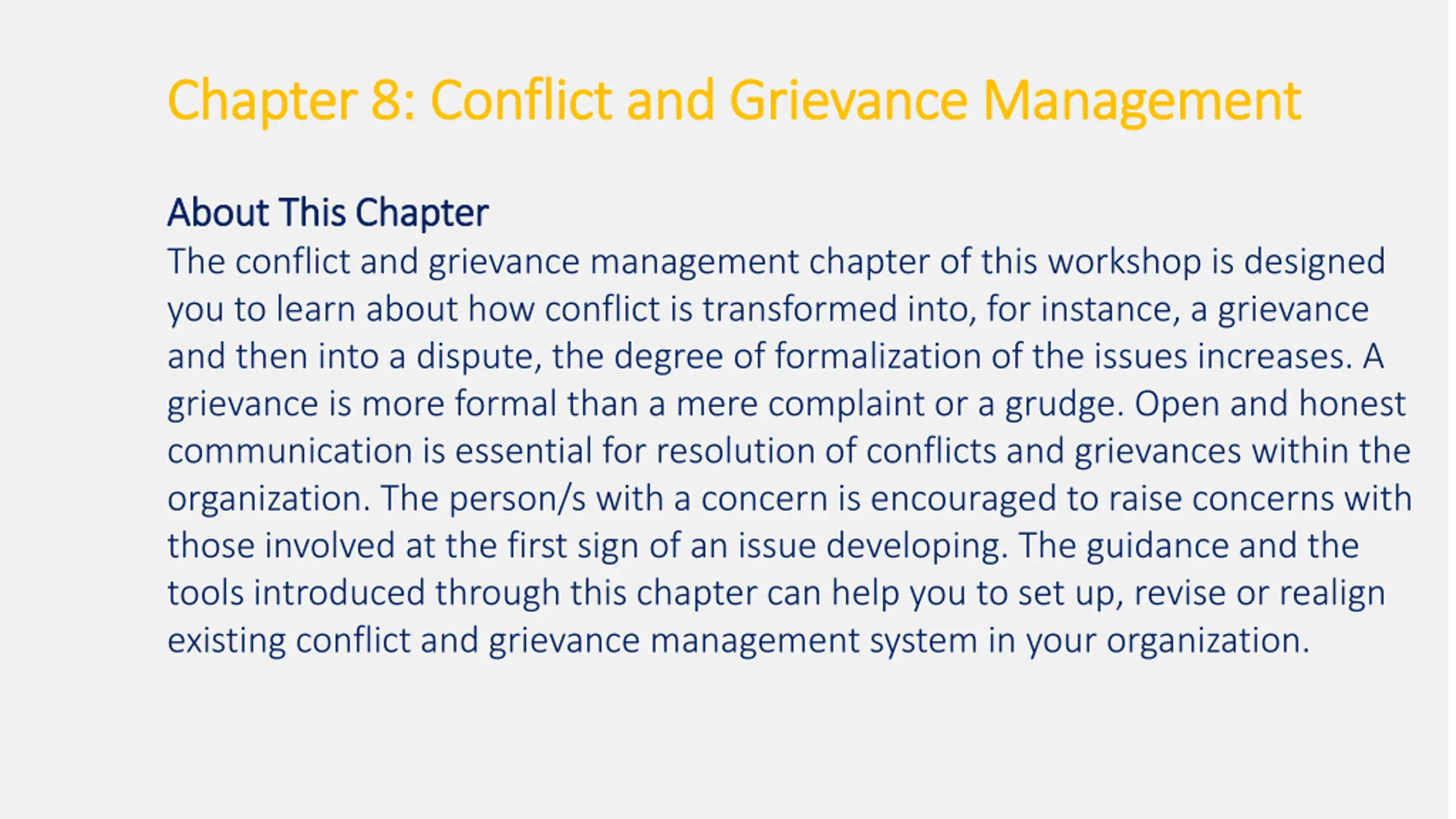 Chapter 8: Conflict and Grievance Management Chapter 8: Conflict and Grievance Management About This Chapter About This Chapter The conflict and grievance management chapter of this workshop is designed you to learn about how conflict is transformed into, for instance, a grievance and then into a dispute, the degree of formalization of the issues increases. A grievance is more formal than a mere complaint or a grudge. Open and honest communication is essential for resolution of conflicts and grievances within the organization. The person/s with a concern is encouraged to raise concerns with those involved at the first sign of an issue developing. The guidance and the tools introduced through this chapter can help you to set up, revise or realign existing conflict and grievance management system in your organization.