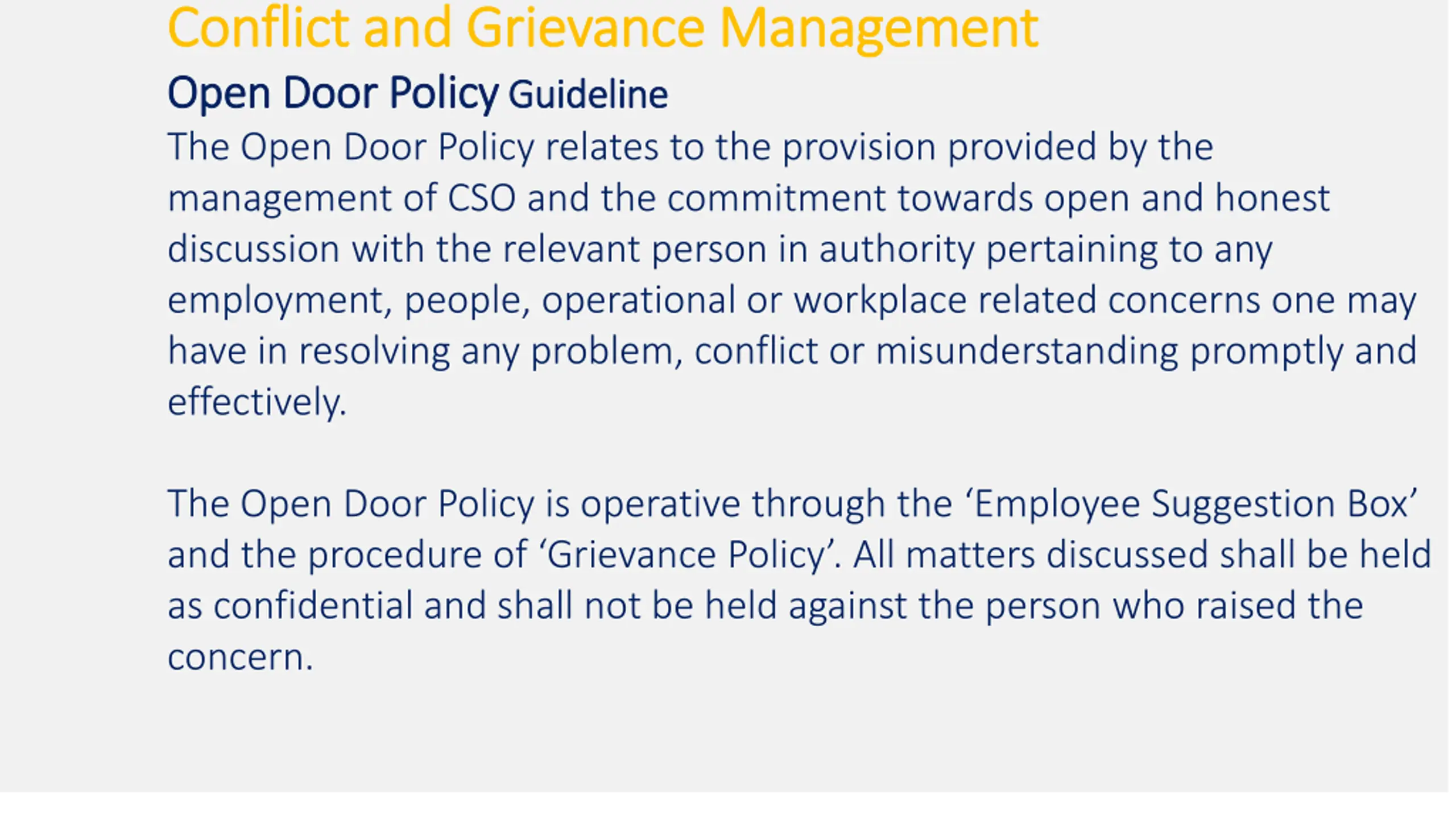 Conflict and Grievance Management Conflict and Grievance Management Open Door Policy Open Door Policy Guideline Guideline The Open Door Policy relates to the provision provided by the management of CSO and the commitment towards open and honest discussion with the relevant person in authority pertaining to any employment, people, operational or workplace related concerns one may have in resolving any problem, conflict or misunderstanding promptly and effectively. The Open Door Policy is operative through the Employee Suggestion Box and the procedure of Grievance Policy . All matters discussed shall be held as confidential and shall not be held against the person who raised the concern.