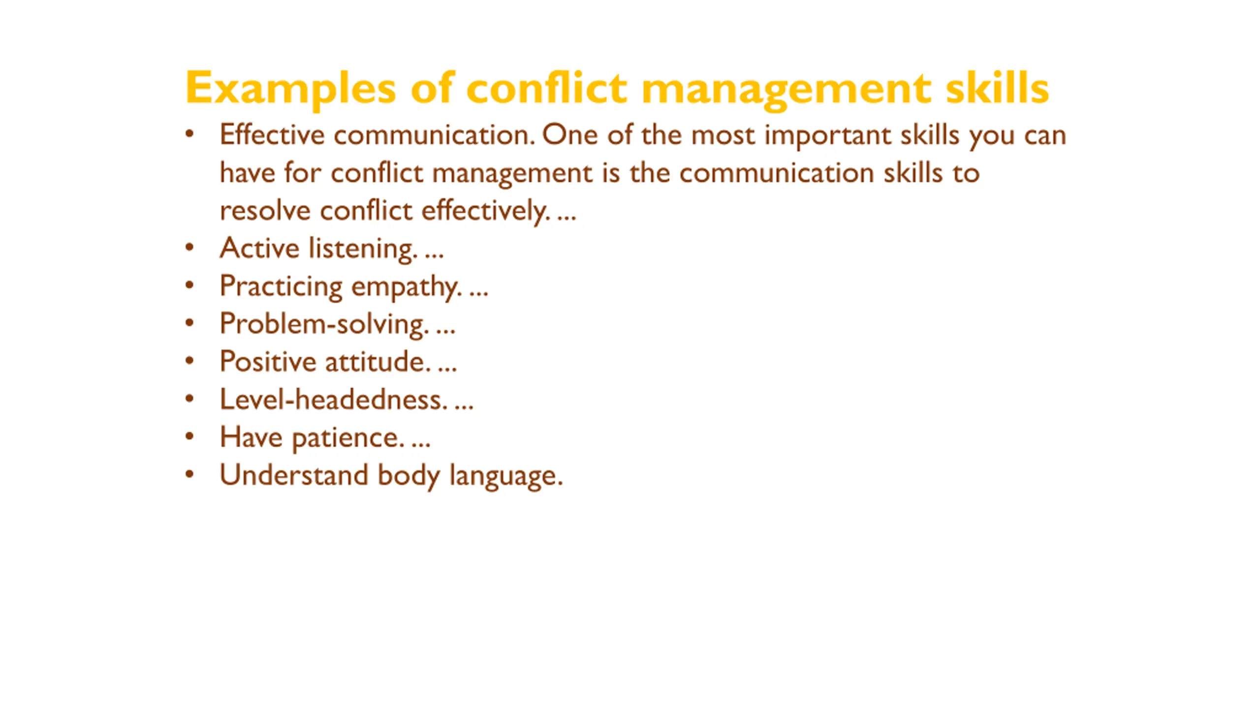 Examples of conflict management skills Effective communication. One of the most important skills you can have for conflict management is the communication skills to resolve conflict effectively. ... Active listening. ... Practicing empathy. ... Problem-solving. ... Positive attitude. ... Level-headedness. ... Have patience. ... Understand body language.