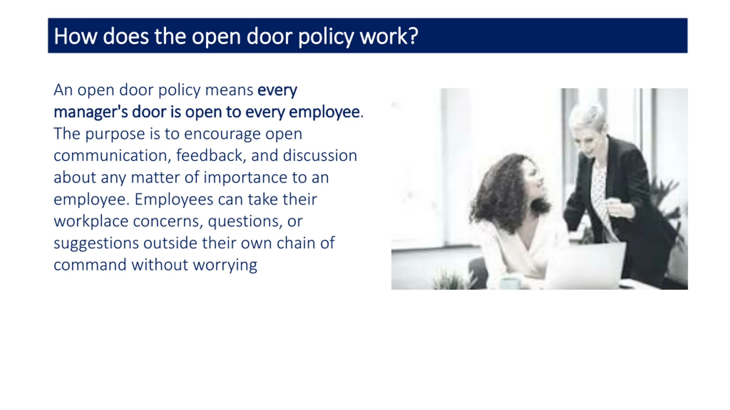 How does the open door policy work? How does the open door policy work? An open door policy means every manager's door is open to every employee manager's door is open to every employee. The purpose is to encourage open communication, feedback, and discussion about any matter of importance to an employee. Employees can take their workplace concerns, questions, or suggestions outside their own chain of command without worrying every Image result for open door policy