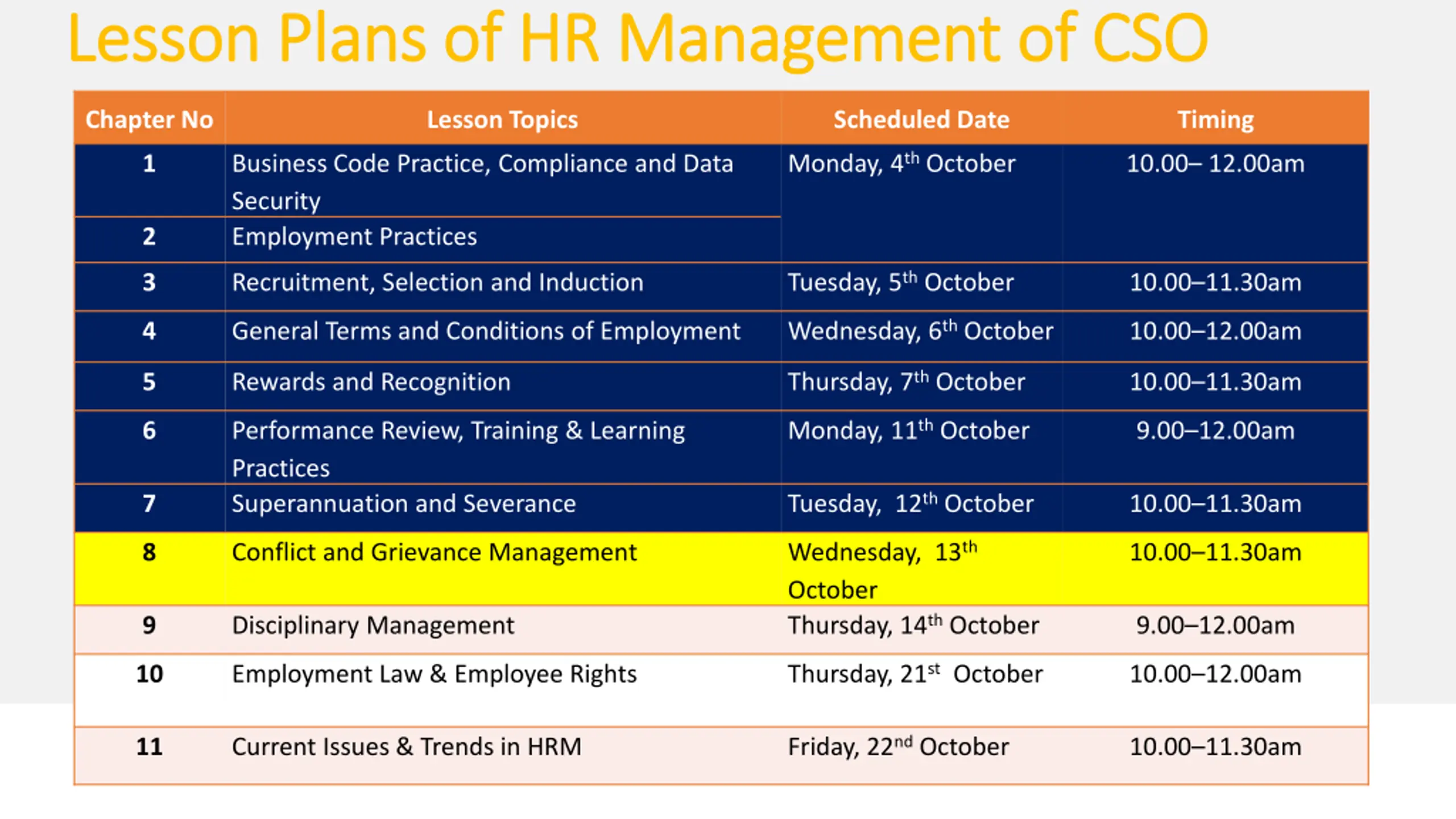 Lesson Plans of HR Management of CSO Lesson Plans of HR Management of CSO Chapter No Lesson Topics Scheduled Date Timing Monday, 4th October 1 Business Code Practice, Compliance and Data Security Employment Practices 10.00 12.00am 2 Tuesday, 5th October 3 Recruitment, Selection and Induction 10.00 11.30am Wednesday, 6th October 4 General Terms and Conditions of Employment 10.00 12.00am Thursday, 7th October 5 Rewards and Recognition 10.00 11.30am Monday, 11th October 6 Performance Review, Training & Learning Practices Superannuation and Severance 9.00 12.00am Tuesday, 12th October 7 10.00 11.30am Wednesday, 13th October Thursday, 14th October 8 Conflict and Grievance Management 10.00 11.30am 9 Disciplinary Management 9.00 12.00am Thursday, 21st October 10 Employment Law & Employee Rights 10.00 12.00am Friday, 22nd October 11 Current Issues & Trends in HRM 10.00 11.30am