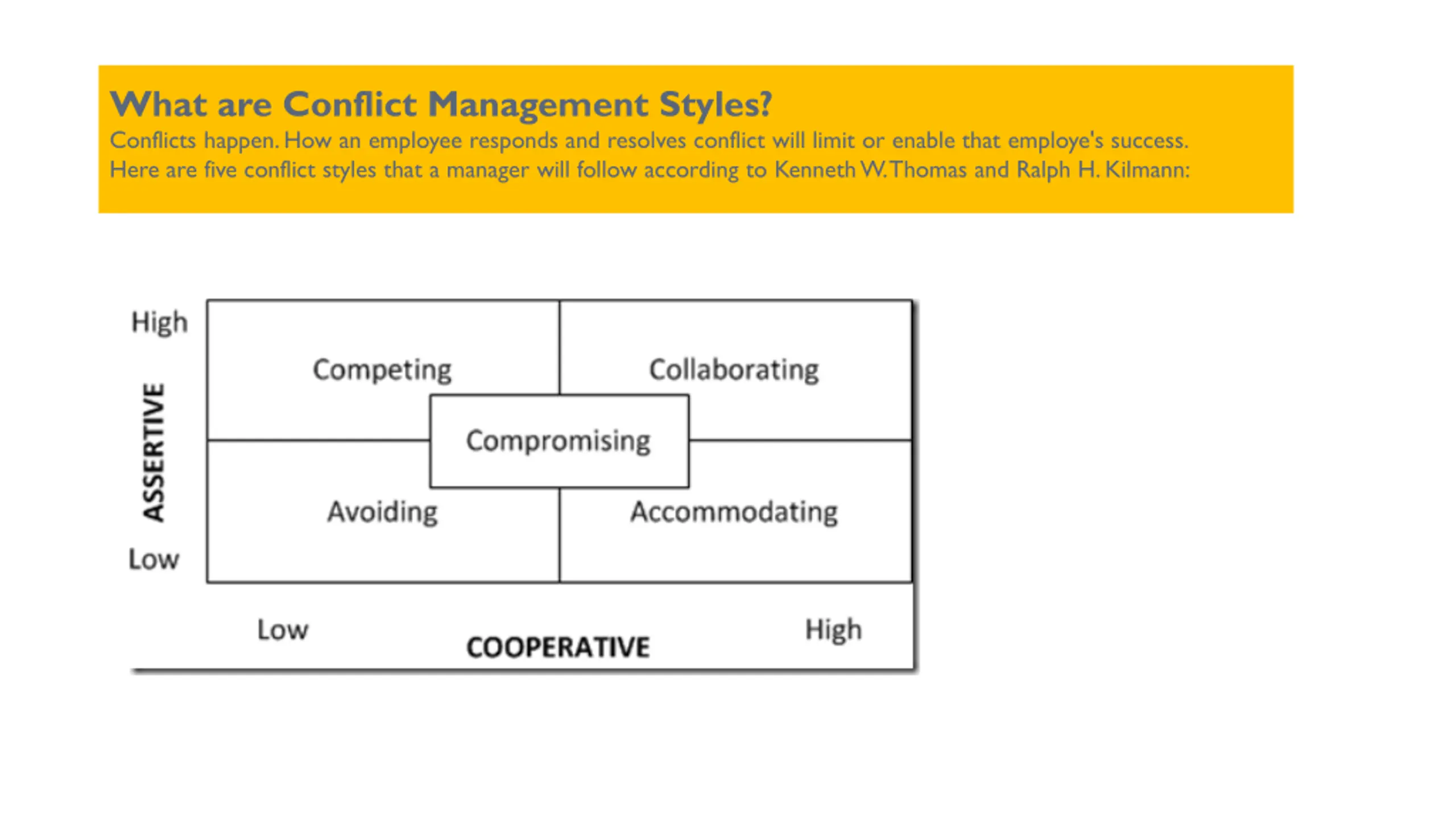 What are Conflict Management Styles? Conflicts happen. How an employee responds and resolves conflict will limit or enable that employe's success. Here are five conflict styles that a manager will follow according to Kenneth W. Thomas and Ralph H. Kilmann: