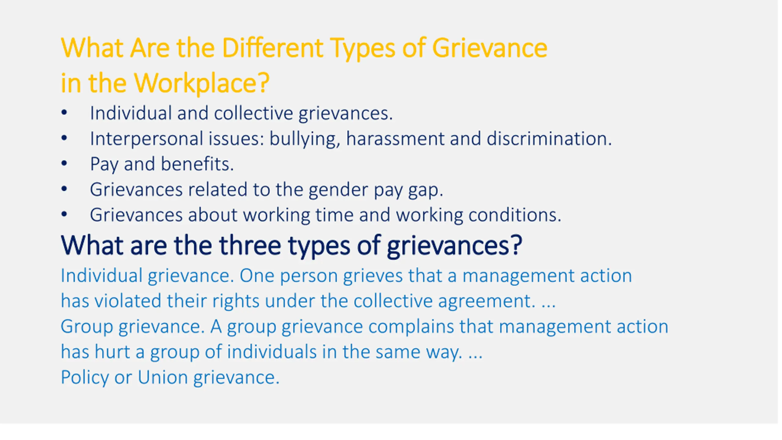 What Are the Different Types of Grievance What Are the Different Types of Grievance in the Workplace? in the Workplace? Individual and collective grievances. Interpersonal issues: bullying, harassment and discrimination. Pay and benefits. Grievances related to the gender pay gap. Grievances about working time and working conditions. What are the three types of grievances? What are the three types of grievances? Individual grievance. One person grieves that a management action has violated their rights under the collective agreement. ... Group grievance. A group grievance complains that management action has hurt a group of individuals in the same way. ... Policy or Union grievance.