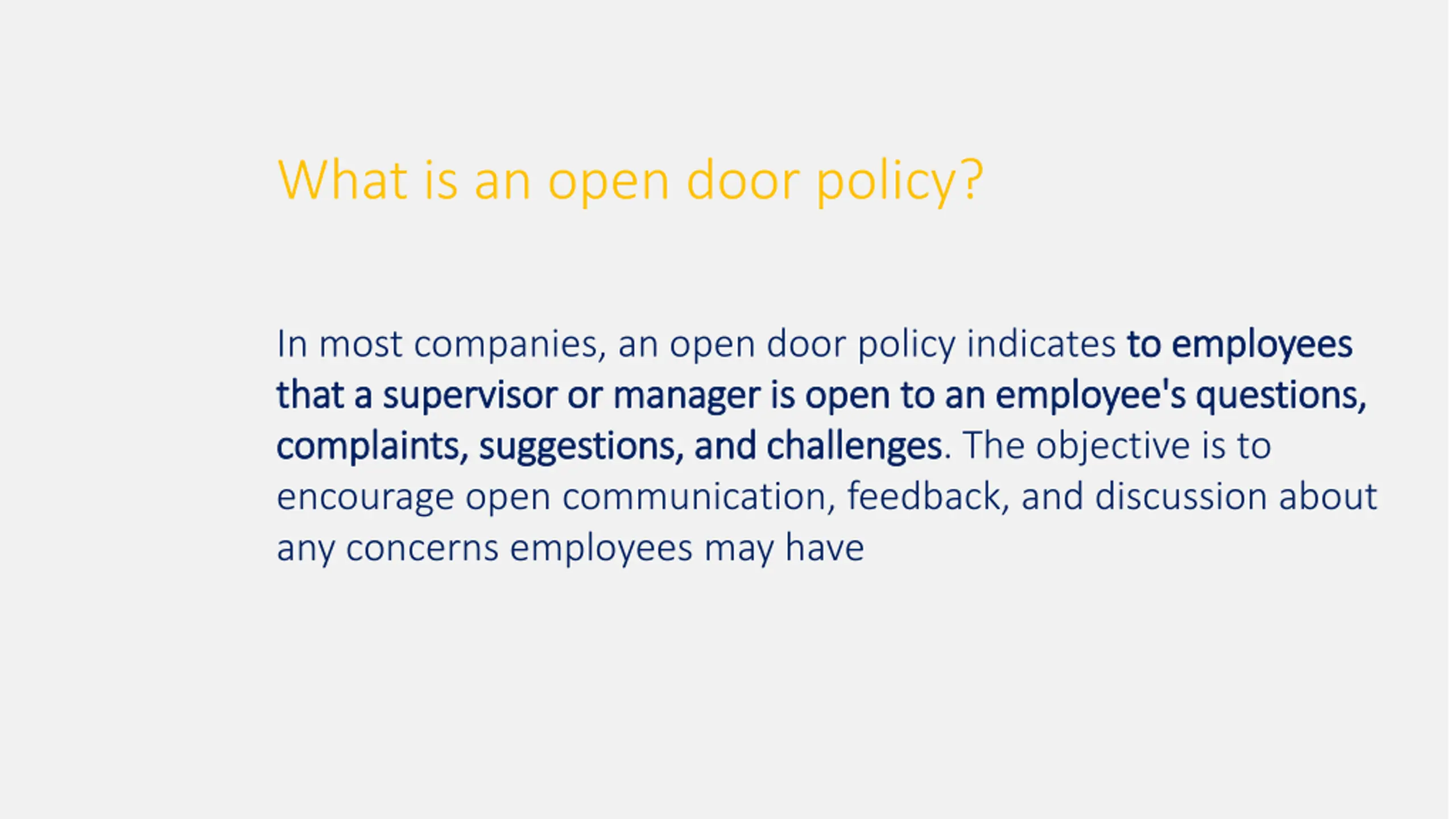 What is an open door policy? In most companies, an open door policy indicates to employees that a supervisor or manager is open to an employee's questions, that a supervisor or manager is open to an employee's questions, complaints, suggestions, and challenges complaints, suggestions, and challenges. The objective is to encourage open communication, feedback, and discussion about any concerns employees may have to employees