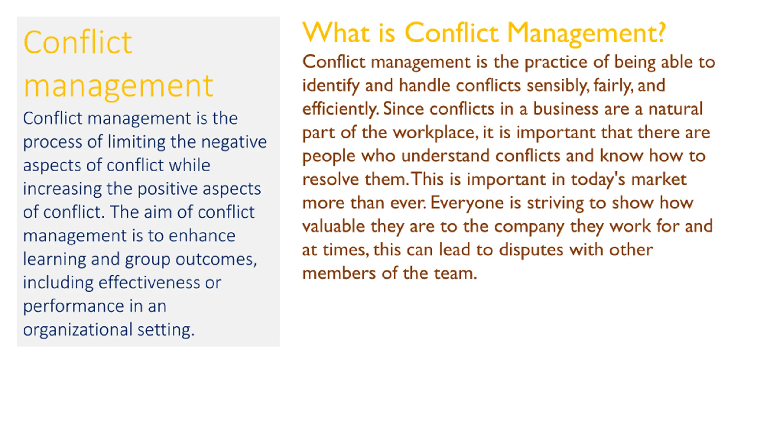 What is Conflict Management? Conflict management is the practice of being able to identify and handle conflicts sensibly, fairly, and efficiently. Since conflicts in a business are a natural part of the workplace, it is important that there are people who understand conflicts and know how to resolve them. This is important in today's market more than ever. Everyone is striving to show how valuable they are to the company they work for and at times, this can lead to disputes with other members of the team. Conflict management Conflict management is the process of limiting the negative aspects of conflict while increasing the positive aspects of conflict. The aim of conflict management is to enhance learning and group outcomes, including effectiveness or performance in an organizational setting.