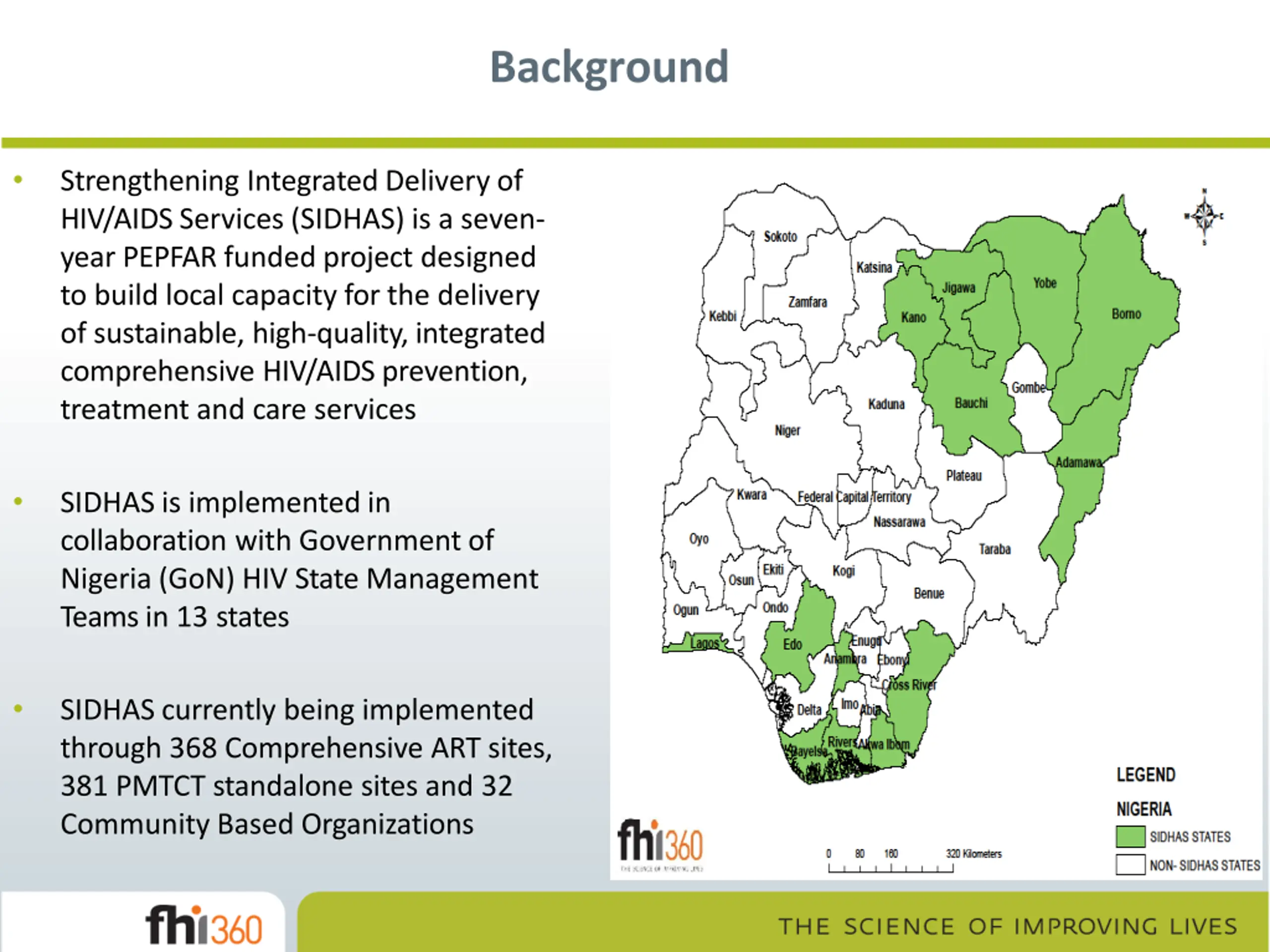 Background Strengthening Integrated Delivery of HIV/AIDS Services (SIDHAS) is a seven- year PEPFAR funded project designed to build local capacity for the delivery of sustainable, high-quality, integrated comprehensive HIV/AIDS prevention, treatment and care services SIDHAS is implemented in collaboration with Government of Nigeria (GoN) HIV State Management Teams in 13 states SIDHAS currently being implemented through 368 Comprehensive ART sites, 381 PMTCT standalone sites and 32 Community Based Organizations