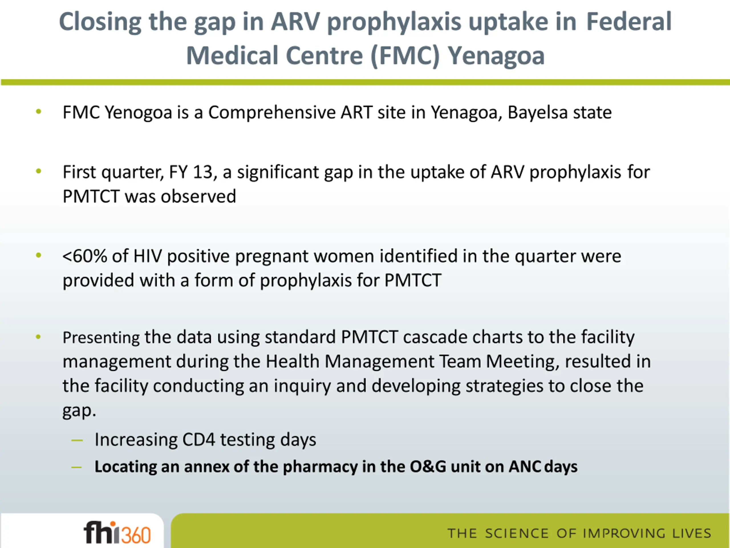 Closing the gap in ARV prophylaxis uptake in Federal Medical Centre (FMC) Yenagoa FMC Yenogoa is a Comprehensive ART site in Yenagoa, Bayelsa state First quarter, FY 13, a significant gap in the uptake of ARV prophylaxis for PMTCT was observed <60% of HIV positive pregnant women identified in the quarter were provided with a form of prophylaxis forPMTCT Presenting the data using standard PMTCT cascade charts to the facility management during the Health Management Team Meeting, resulted in the facility conducting an inquiry and developing strategies to close the gap. Increasing CD4 testing days Locating an annex of the pharmacy in the O&G unit on ANCdays