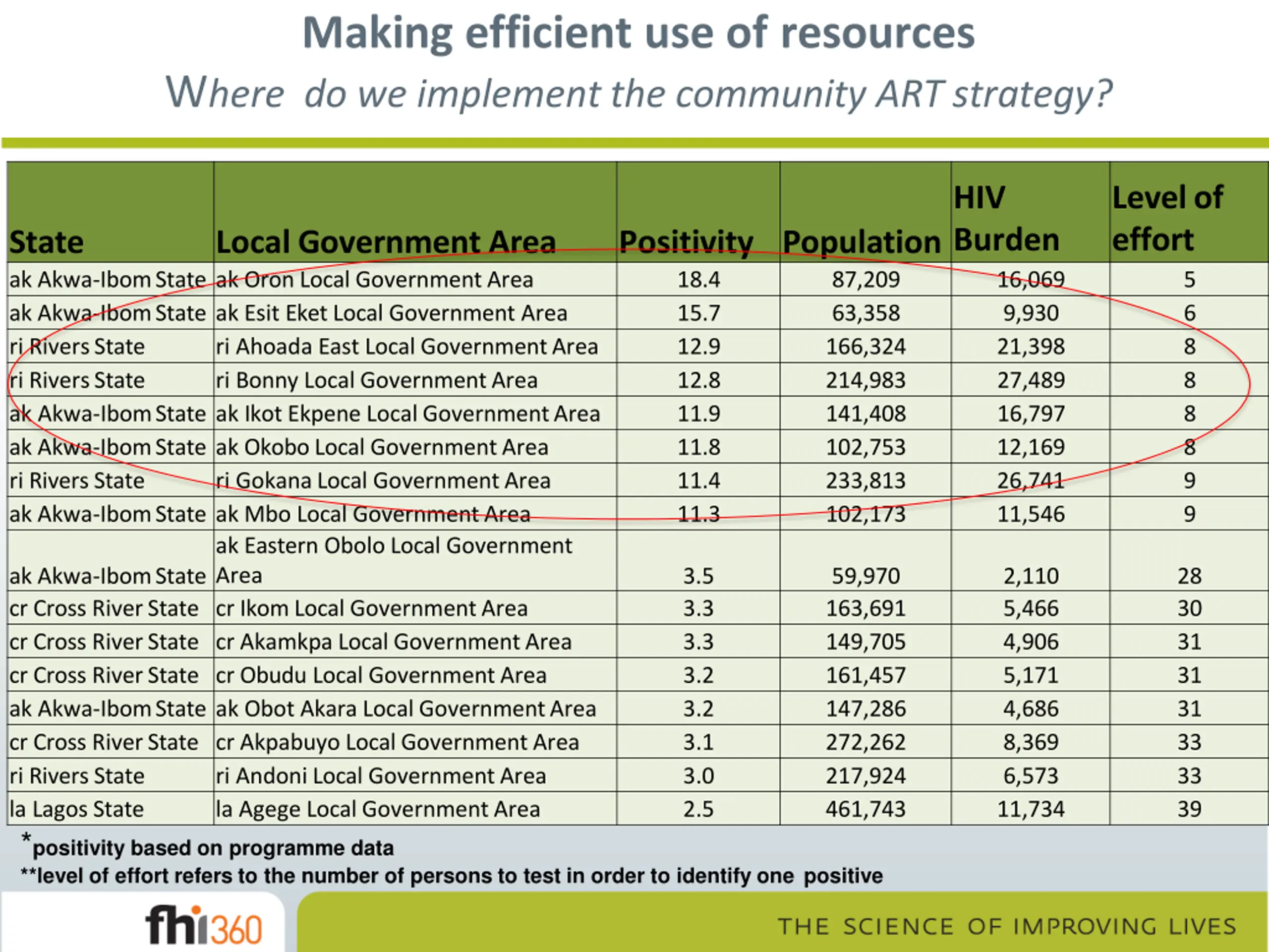 Making efficient use of resources Where do we implement the community ART strategy? HIV Burden 16,069 9,930 21,398 27,489 16,797 12,169 26,741 11,546 Levelof effort State ak Akwa-IbomState ak Oron Local GovernmentArea ak Akwa-IbomState ak Esit Eket Local Government Area ri RiversState ri Ahoada East Local GovernmentArea ri RiversState ri Bonny Local GovernmentArea ak Akwa-IbomState ak Ikot Ekpene Local GovernmentArea ak Akwa-IbomState ak Okobo Local GovernmentArea ri RiversState ri Gokana Local GovernmentArea ak Akwa-IbomState ak Mbo Local GovernmentArea ak Eastern Obolo Local Government Area cr Cross RiverState cr Ikom Local GovernmentArea cr Cross RiverState cr Akamkpa Local GovernmentArea cr Cross RiverState cr Obudu Local GovernmentArea ak Akwa-IbomState ak Obot Akara Local GovernmentArea cr Cross RiverState cr Akpabuyo Local Government Area ri RiversState ri Andoni Local GovernmentArea la Lagos State la Agege Local GovernmentArea *positivity based on programme data **level of effort refers to the number of persons to test in order to identify one positive Local Government Area Positivity Population 18.4 15.7 12.9 12.8 11.9 11.8 11.4 11.3 87,209 63,358 166,324 214,983 141,408 102,753 233,813 102,173 5 6 8 8 8 8 9 9 ak Akwa-IbomState 3.5 3.3 3.3 3.2 3.2 3.1 3.0 2.5 59,970 163,691 149,705 161,457 147,286 272,262 217,924 461,743 2,110 5,466 4,906 5,171 4,686 8,369 6,573 11,734 28 30 31 31 31 33 33 39