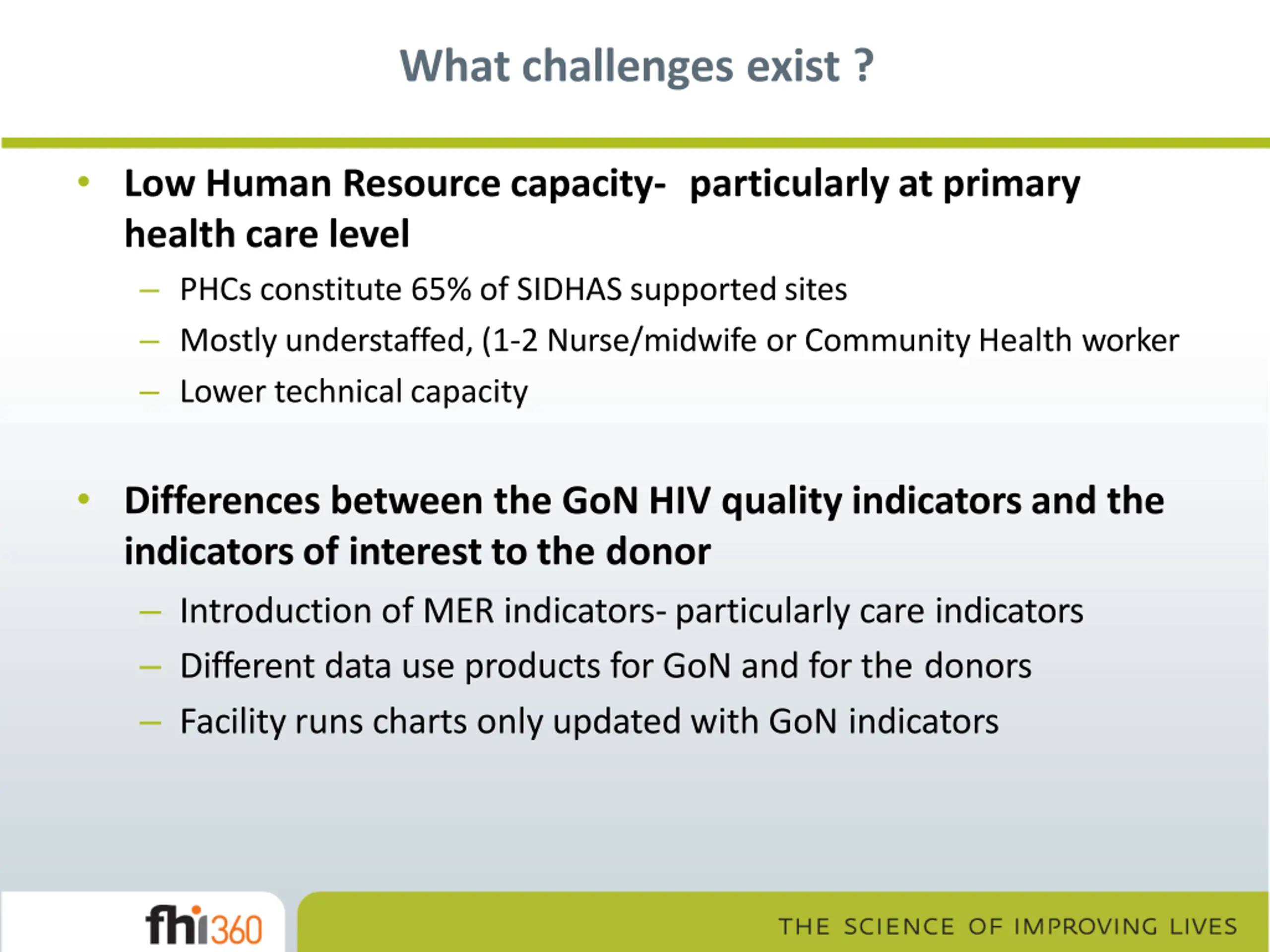 What challenges exist ? Low Human Resource capacity- particularly at primary health care level PHCs constitute 65% of SIDHAS supportedsites Mostly understaffed, (1-2 Nurse/midwife or Community Health worker Lower technicalcapacity Differences between the GoN HIV quality indicators and the indicators of interest to the donor Introduction of MER indicators-particularly care indicators Different data use products for GoN and for the donors Facility runs charts only updated with GoN indicators
