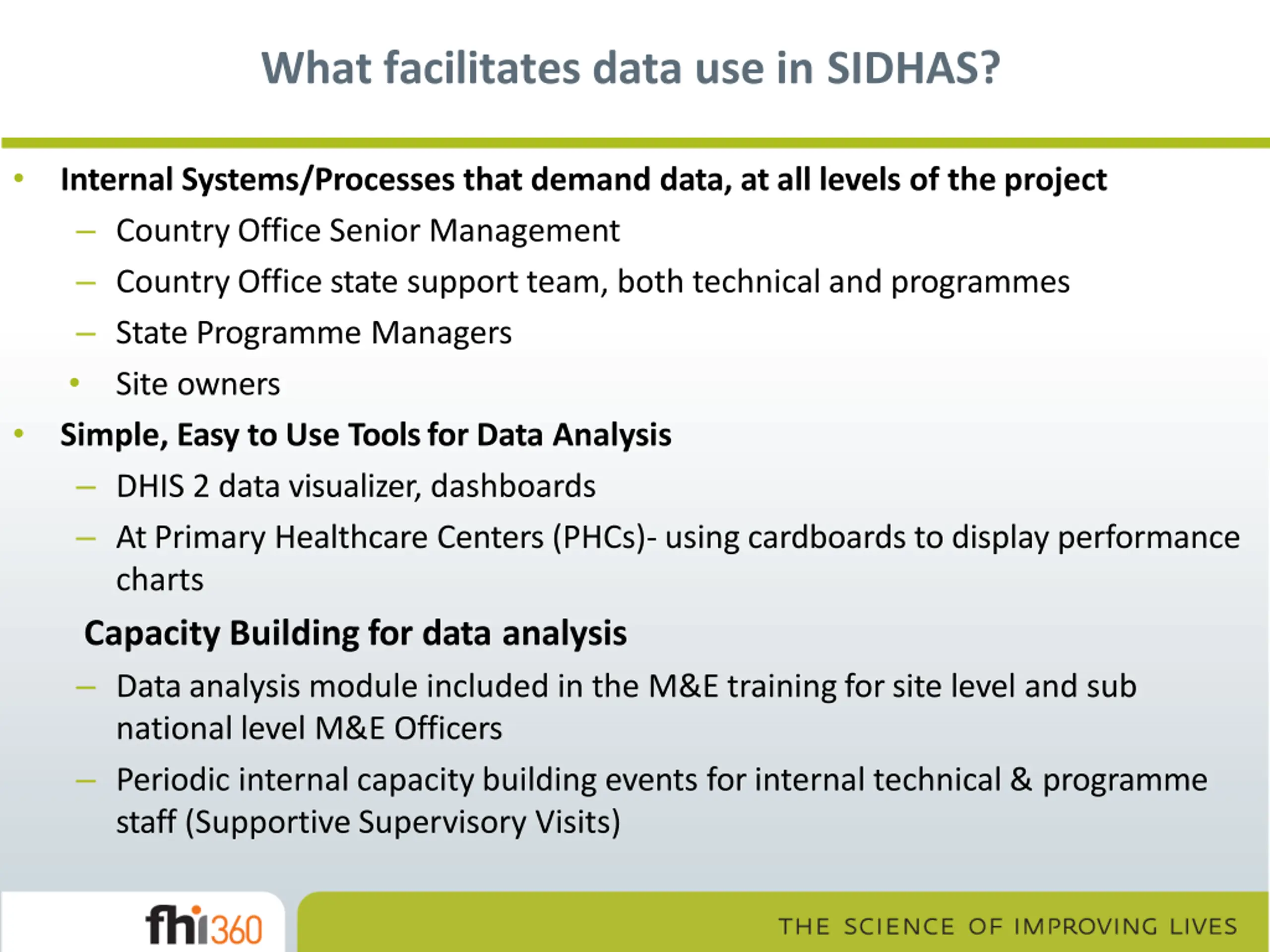 What facilitates data use in SIDHAS? Internal Systems/Processes that demand data, at all levels of the project Country Office Senior Management Country Office state support team, both technical and programmes State Programme Managers Site owners Simple, Easy to Use Tools for Data Analysis DHIS 2 data visualizer, dashboards At Primary Healthcare Centers (PHCs)- using cardboards to display performance charts Capacity Building for data analysis Data analysis module included in the M&E training for site level and sub national level M&E Officers Periodic internal capacity building events for internal technical & programme staff (Supportive Supervisory Visits)