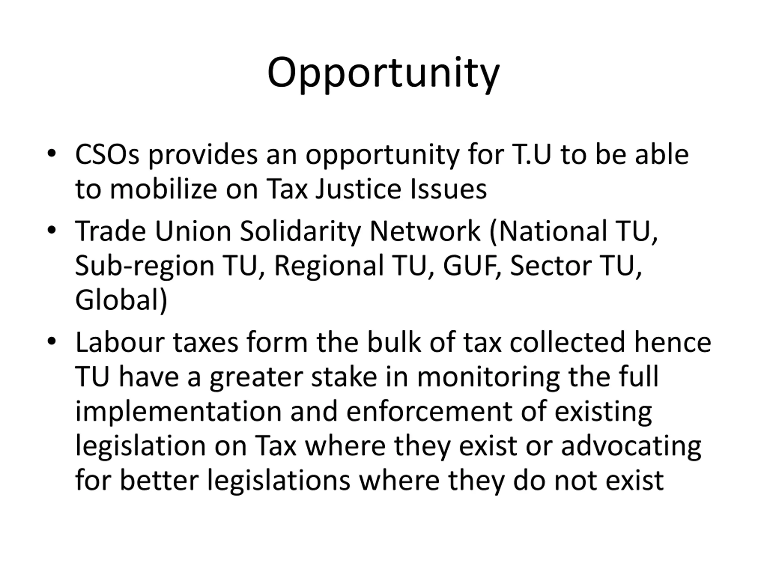 Opportunity CSOs provides an opportunity for T.U to be able to mobilize on Tax Justice Issues Trade Union Solidarity Network (National TU, Sub-region TU, Regional TU, GUF, Sector TU, Global) Labour taxes form the bulk of tax collected hence TU have a greater stake in monitoring the full implementation and enforcement of existing legislation on Tax where they exist or advocating for better legislations where they do not exist
