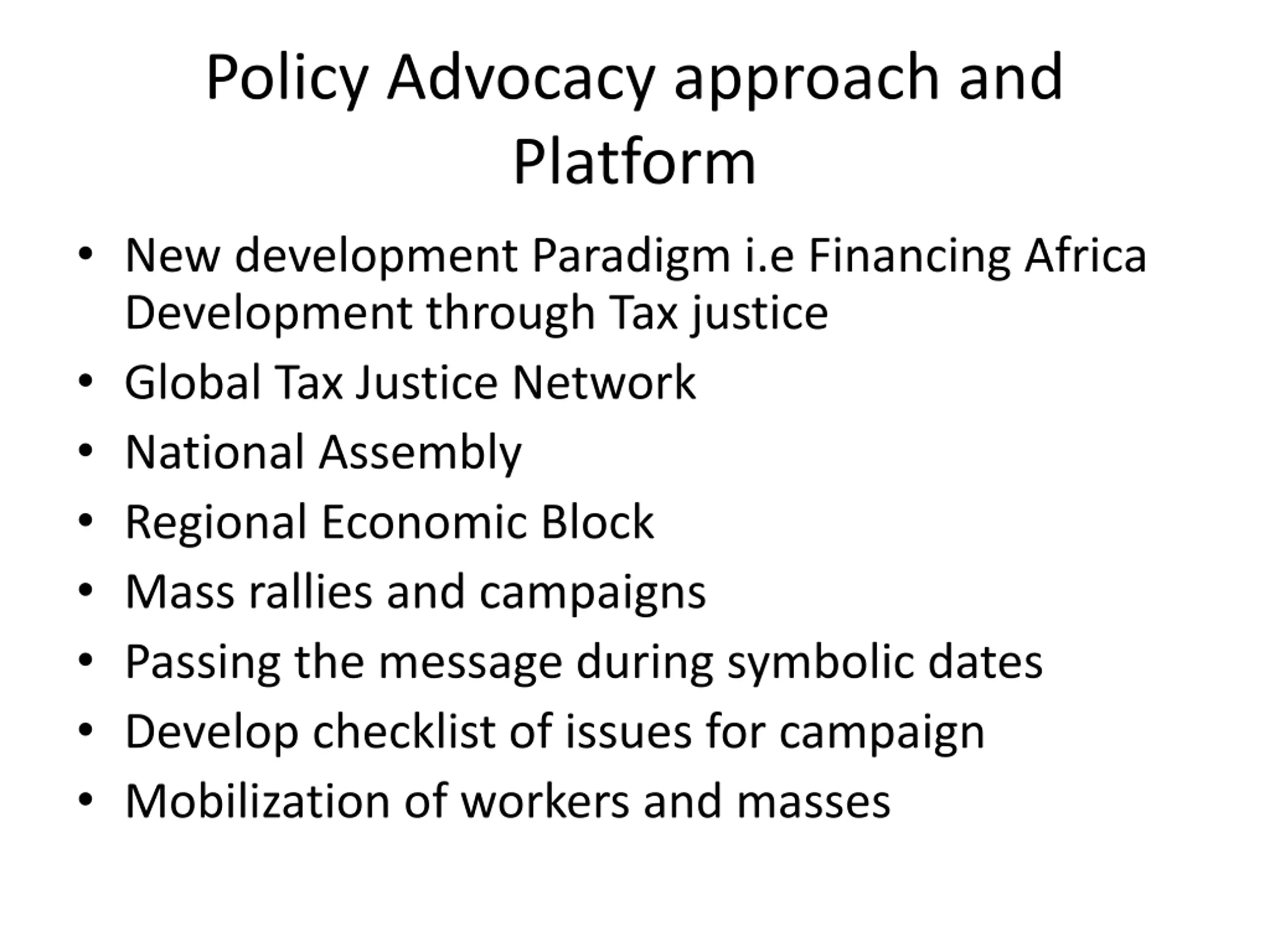 Policy Advocacy approach and Platform New development Paradigm i.e Financing Africa Development through Tax justice Global Tax Justice Network National Assembly Regional Economic Block Mass rallies and campaigns Passing the message during symbolic dates Develop checklist of issues for campaign Mobilization of workers and masses