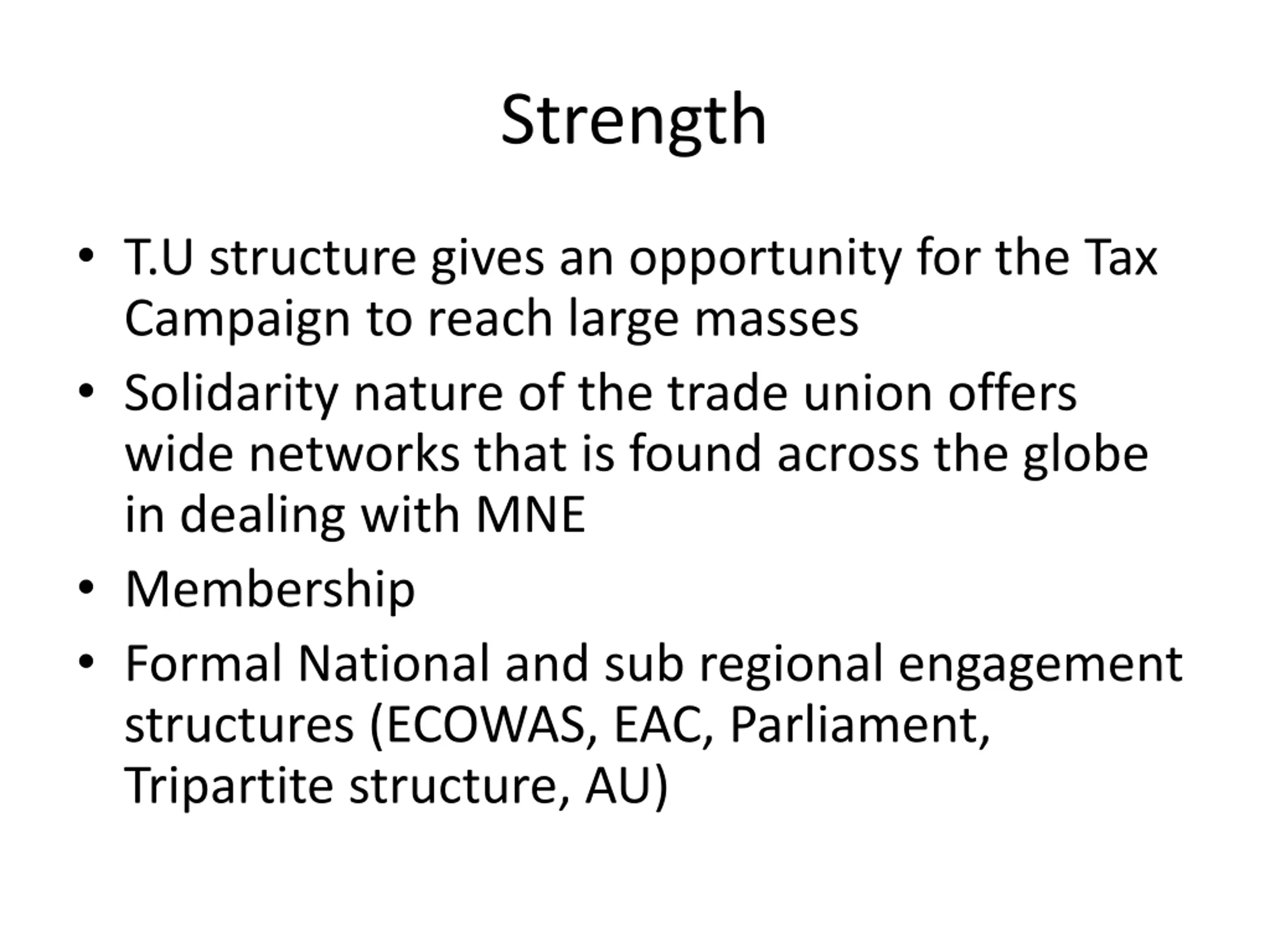 Strength T.U structure gives an opportunity for the Tax Campaign to reach large masses Solidarity nature of the trade union offers wide networks that is found across the globe in dealing with MNE Membership Formal National and sub regional engagement structures (ECOWAS, EAC, Parliament, Tripartite structure, AU)
