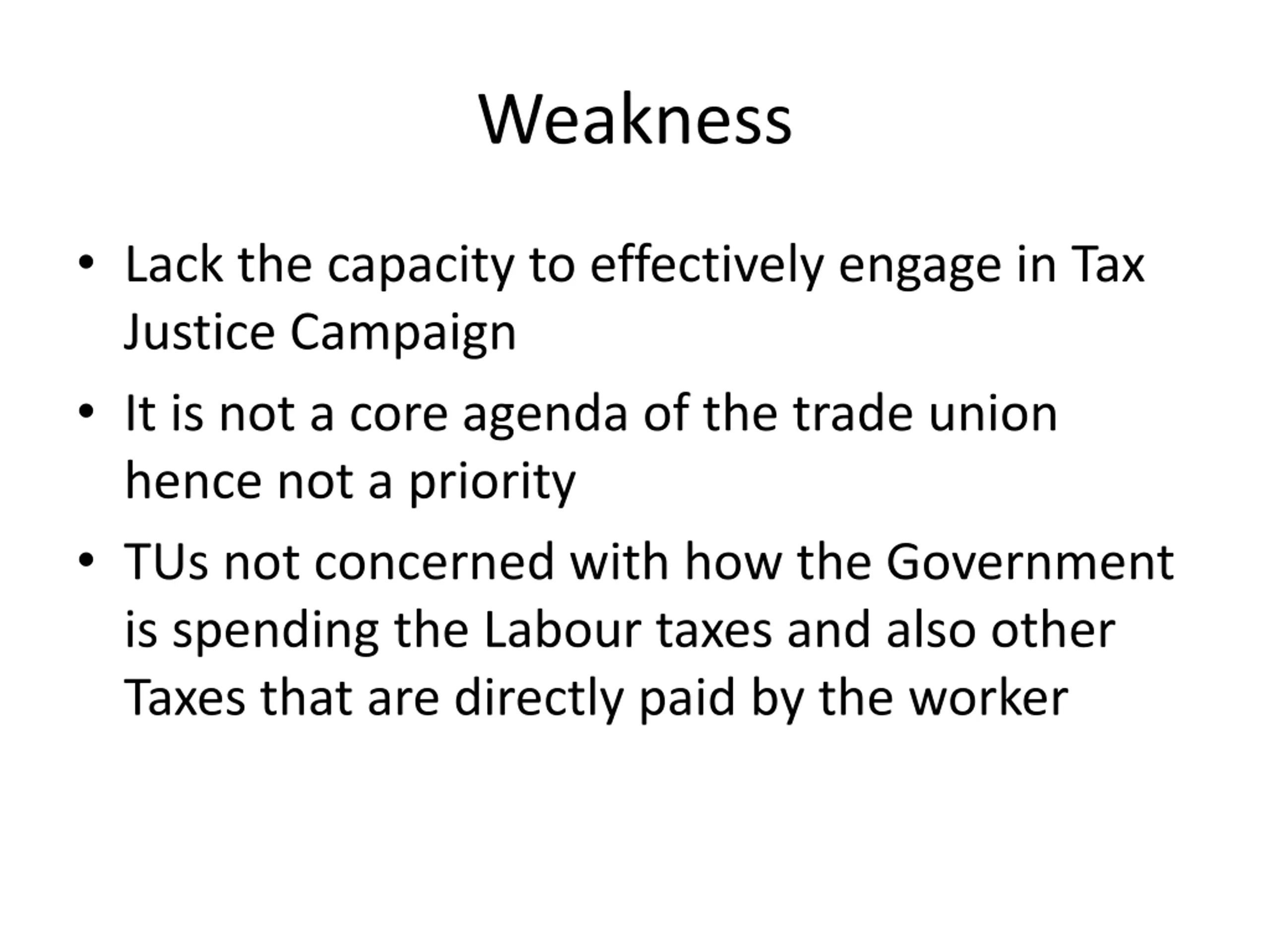 Weakness Lack the capacity to effectively engage in Tax Justice Campaign It is not a core agenda of the trade union hence not a priority TUs not concerned with how the Government is spending the Labour taxes and also other Taxes that are directly paid by the worker
