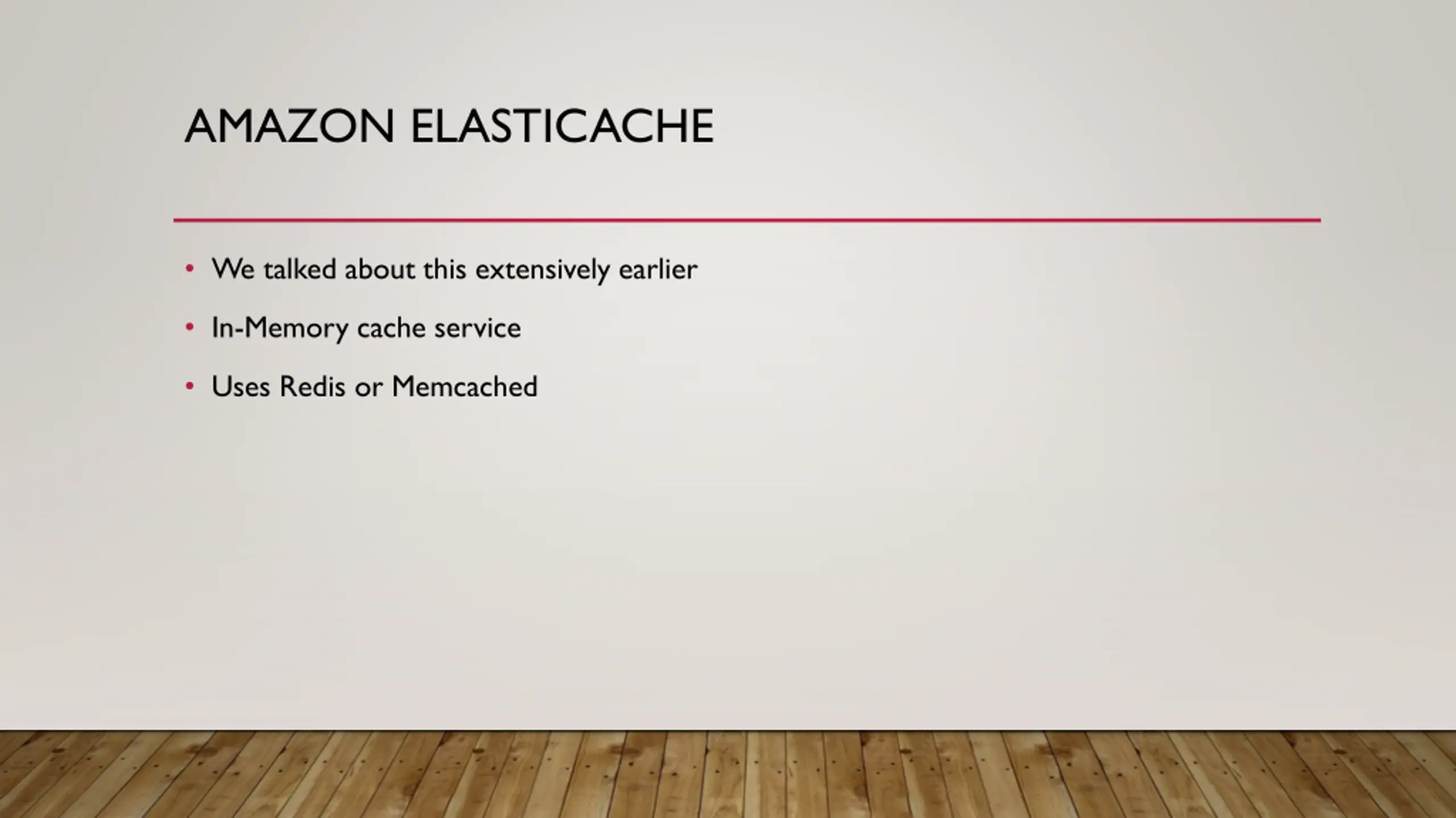 AMAZON ELASTICACHE We talked about this extensively earlier In-Memory cache service Uses Redis or Memcached