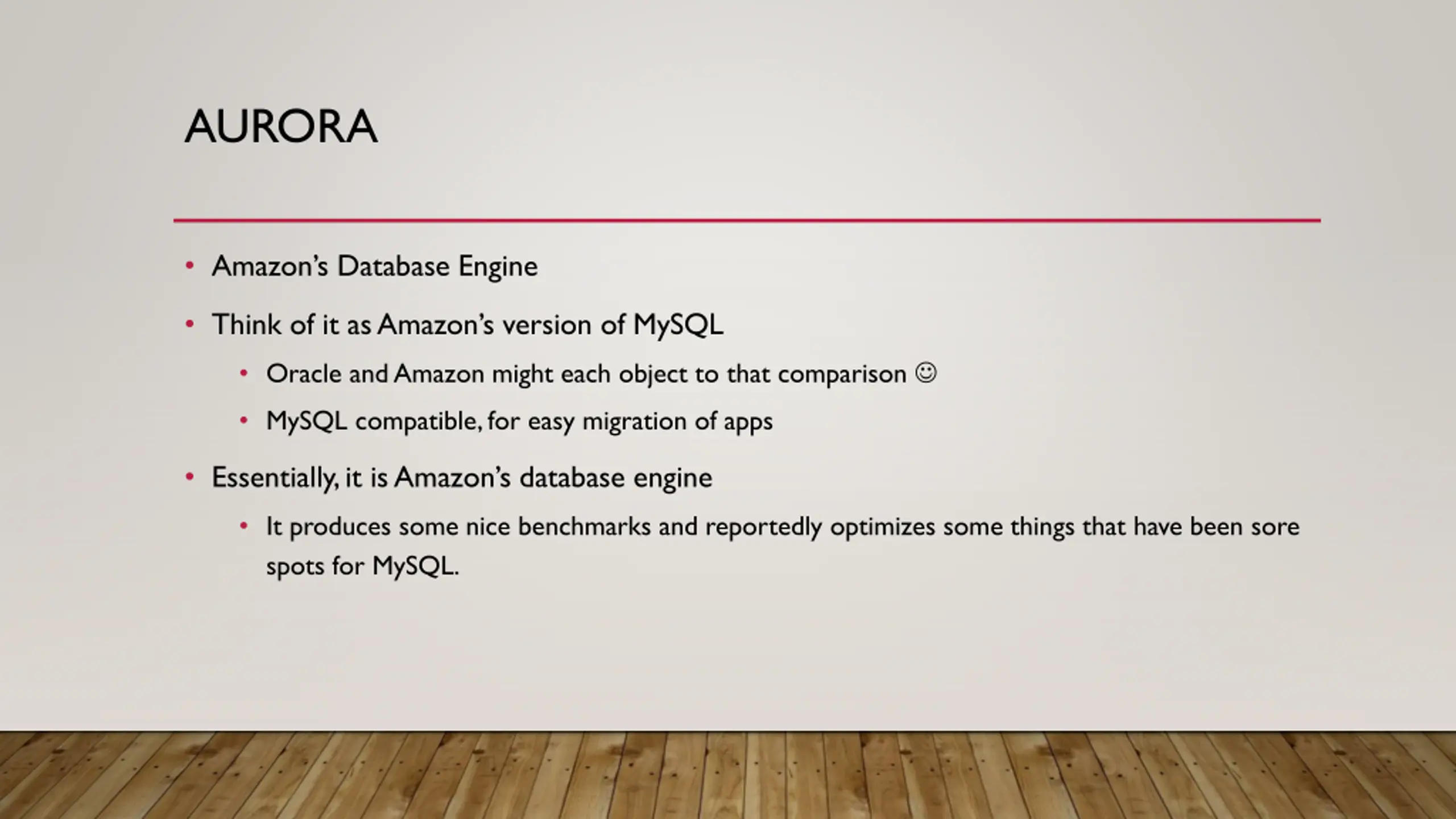 AURORA Amazon s Database Engine Think of it as Amazon s version of MySQL Oracle and Amazon might each object to that comparison MySQL compatible, for easy migration of apps Essentially, it is Amazon s database engine It produces some nice benchmarks and reportedly optimizes some things that have been sore spots for MySQL.