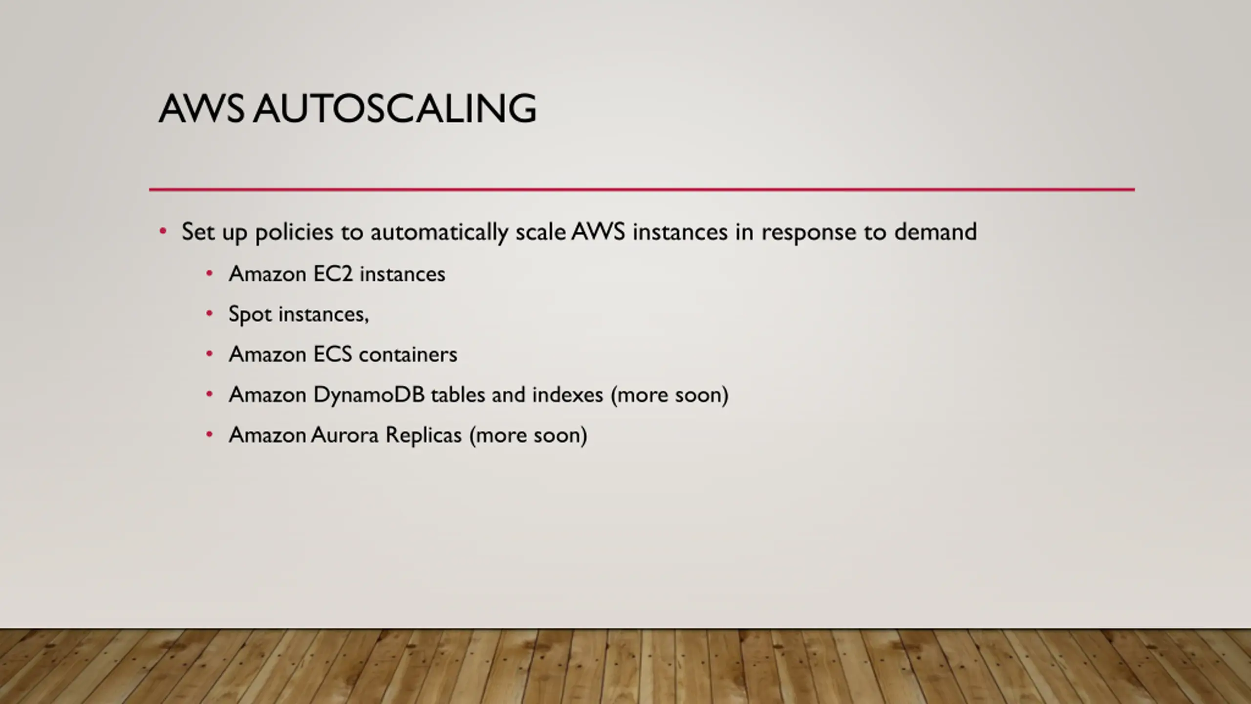 AWS AUTOSCALING Set up policies to automatically scale AWS instances in response to demand Amazon EC2 instances Spot instances, Amazon ECS containers Amazon DynamoDB tables and indexes (more soon) Amazon Aurora Replicas (more soon)