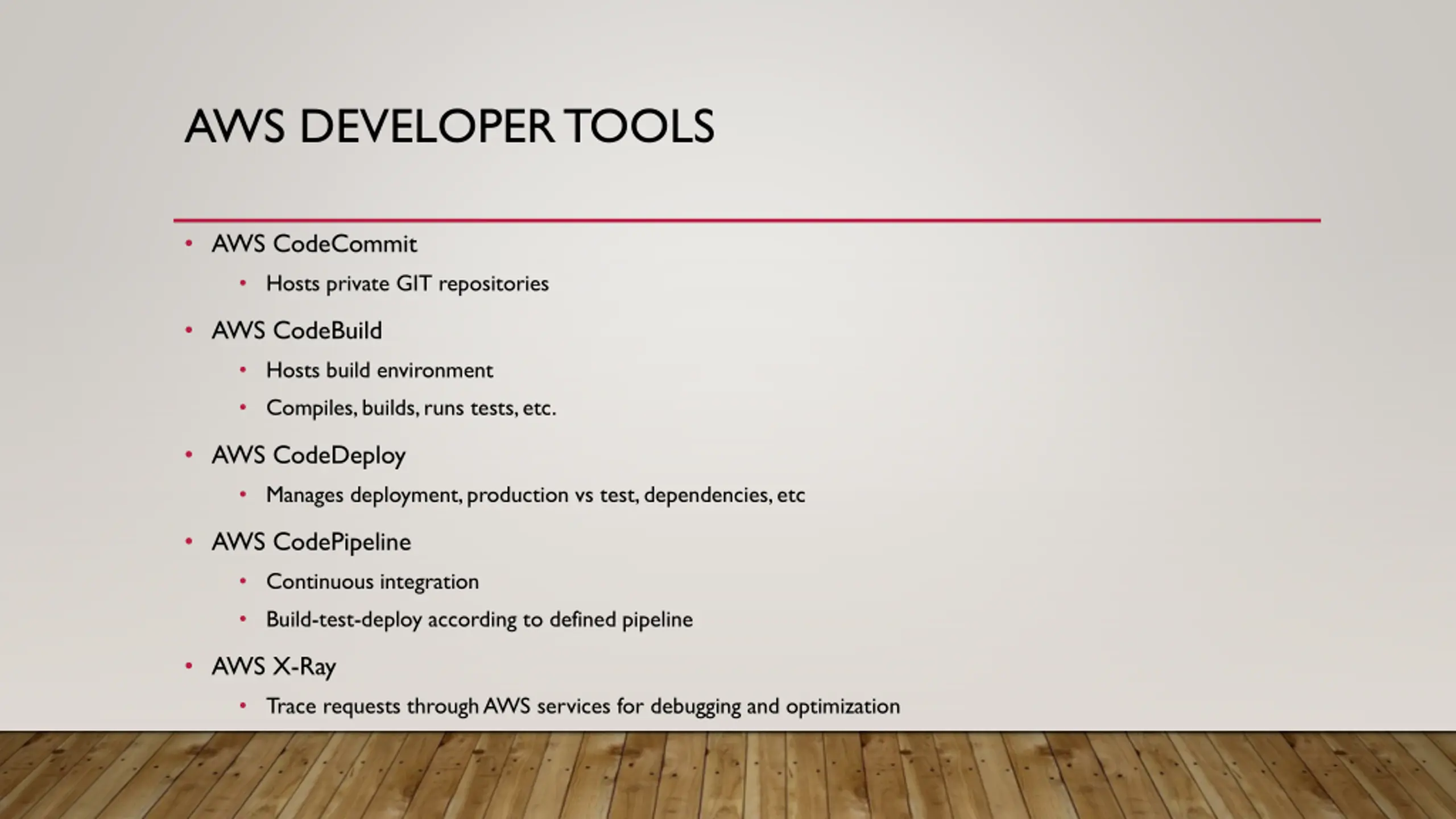 AWS DEVELOPER TOOLS AWS CodeCommit Hosts private GIT repositories AWS CodeBuild Hosts build environment Compiles, builds, runs tests, etc. AWS CodeDeploy Manages deployment, production vs test, dependencies, etc AWS CodePipeline Continuous integration Build-test-deploy according to defined pipeline AWS X-Ray Trace requests through AWS services for debugging and optimization