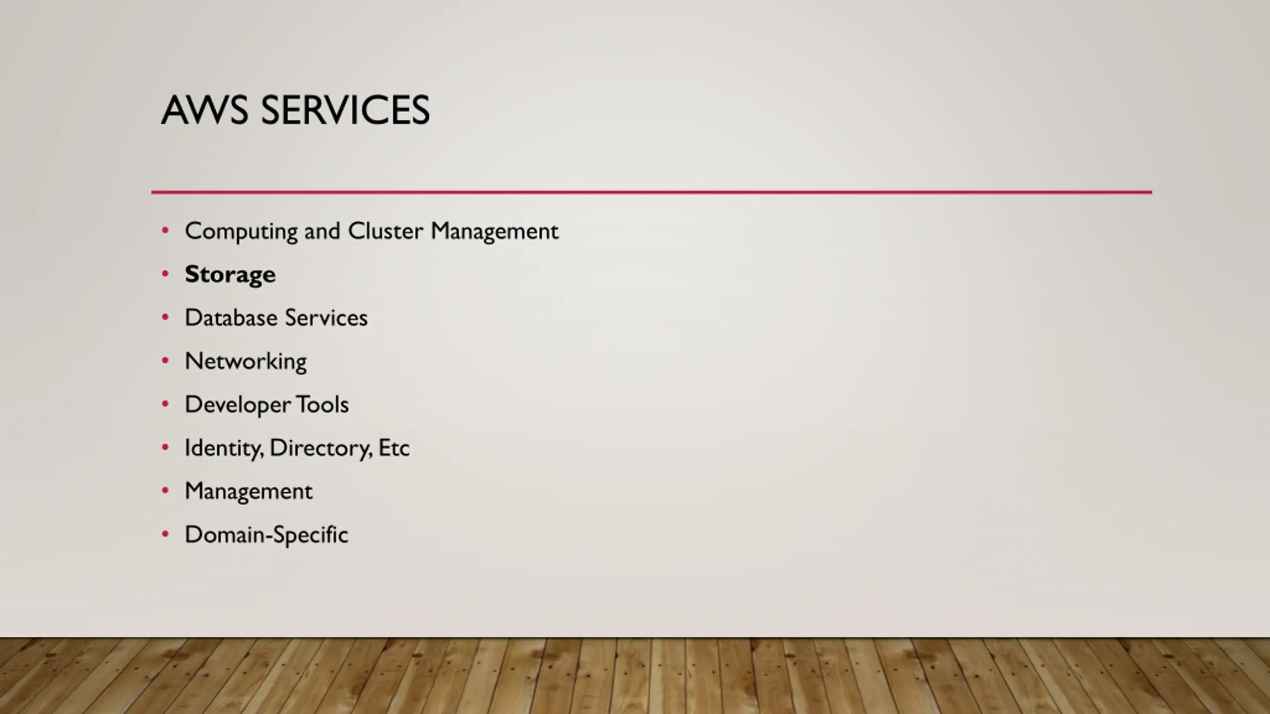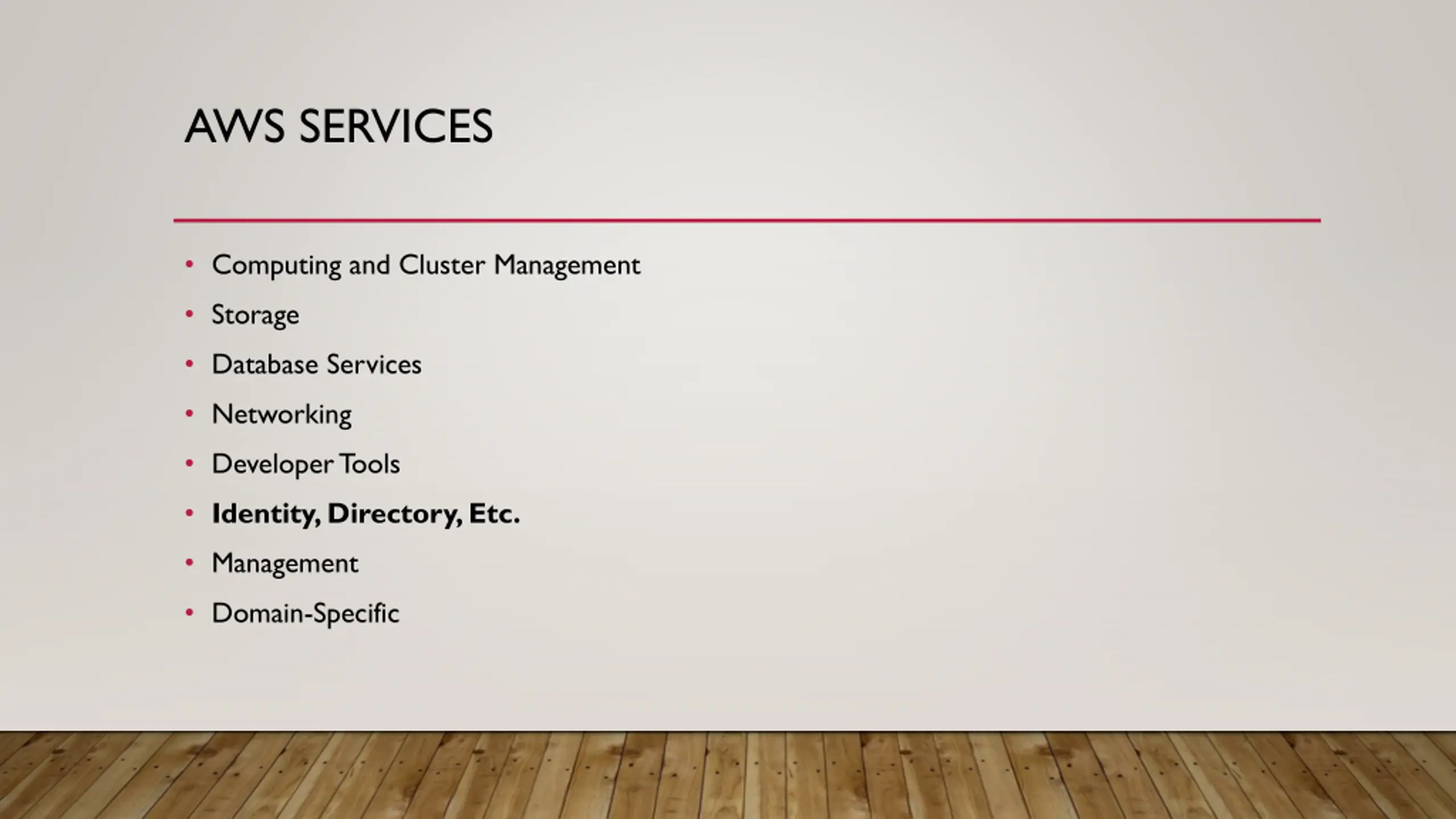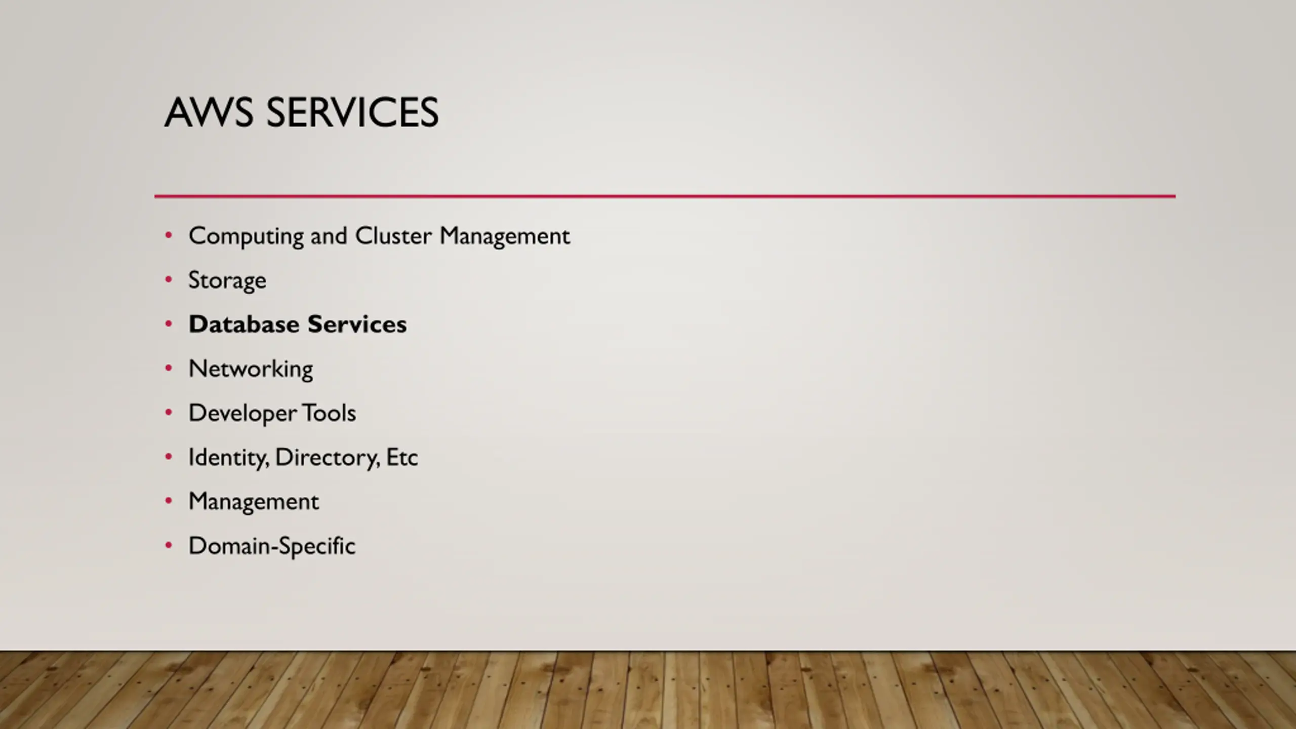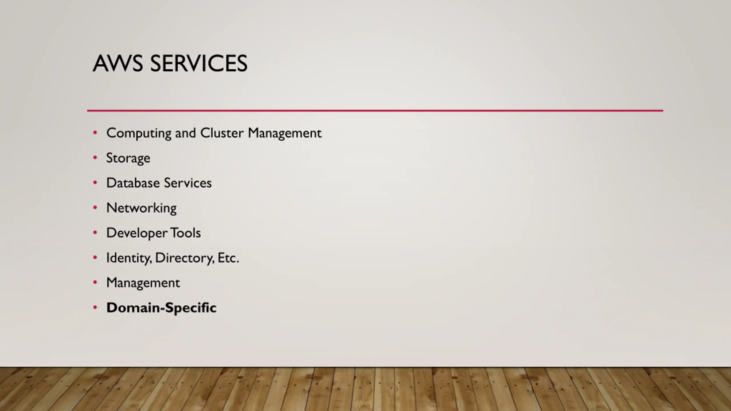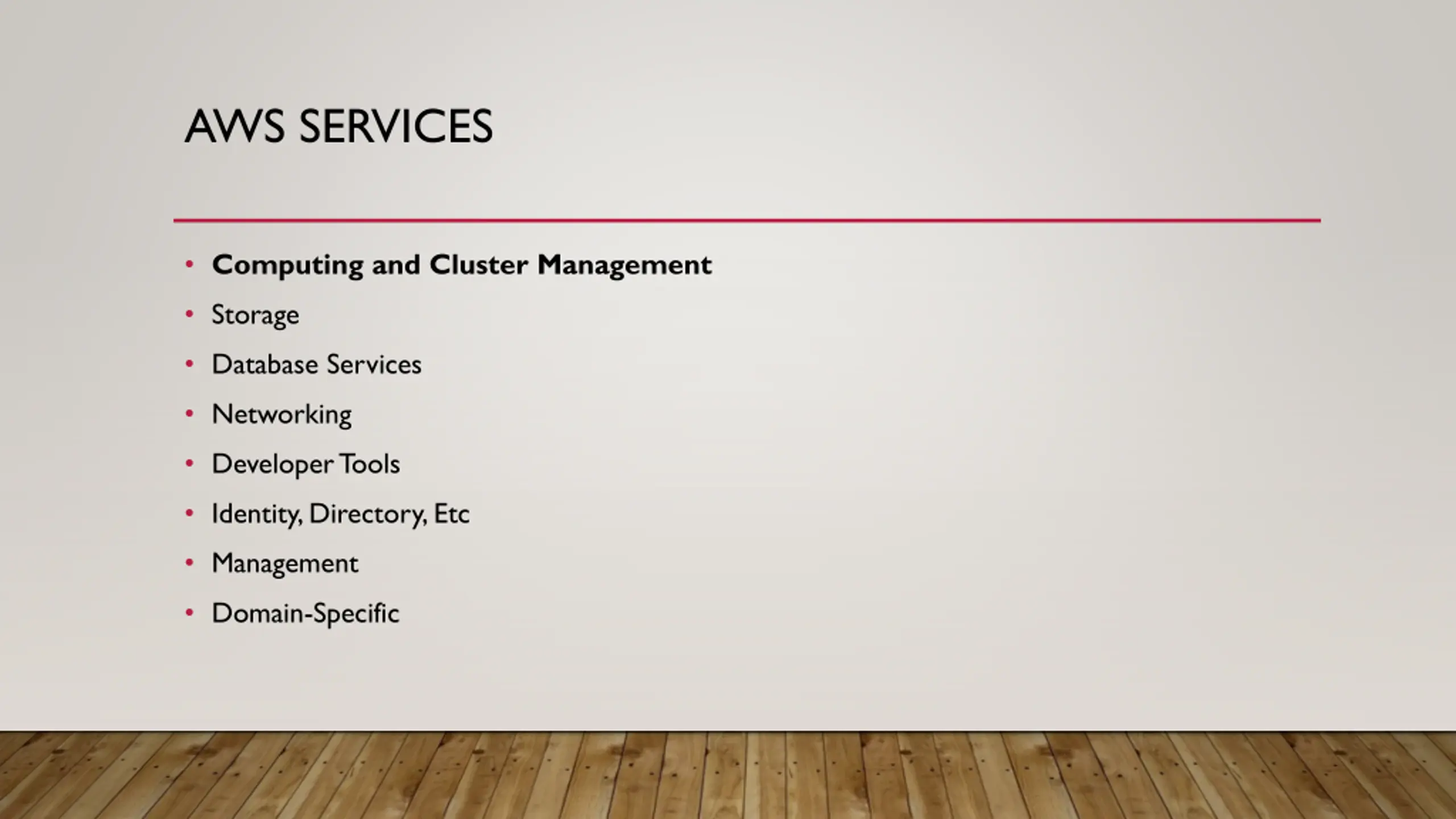 AWS SERVICES Computing and Cluster Management Storage Database Services Networking Developer Tools Identity, Directory, Etc Management Domain-Specific