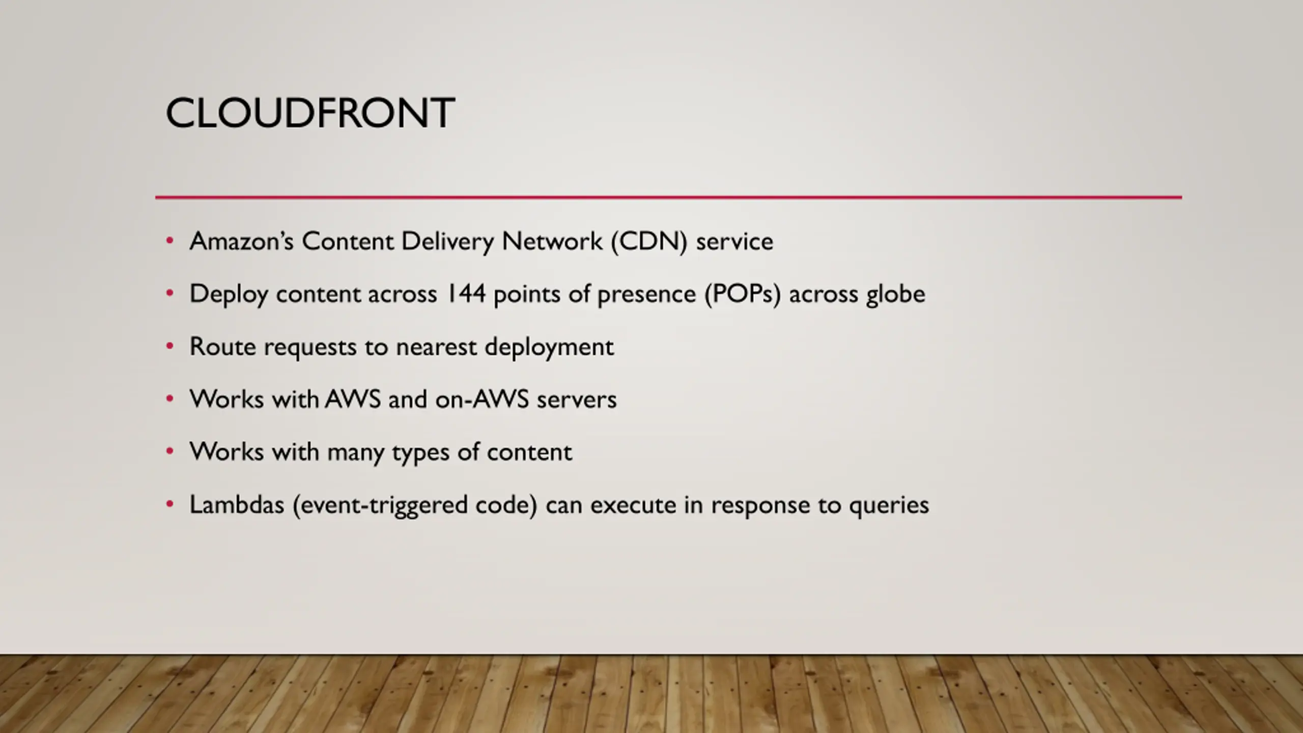 CLOUDFRONT Amazon s Content Delivery Network (CDN) service Deploy content across 144 points of presence (POPs) across globe Route requests to nearest deployment Works with AWS and on-AWS servers Works with many types of content Lambdas (event-triggered code) can execute in response to queries