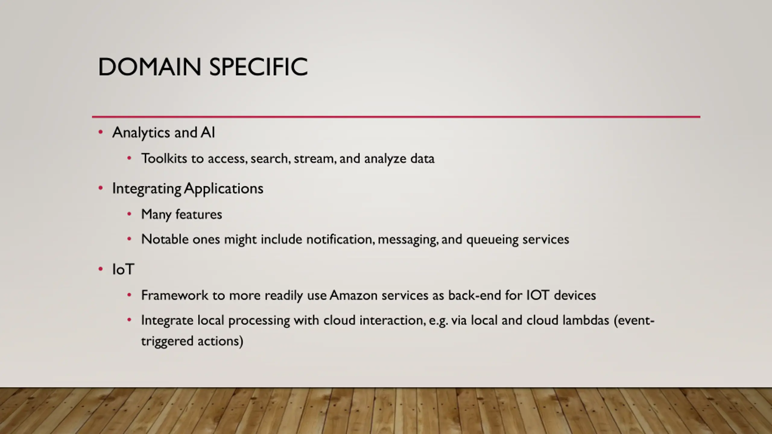 DOMAIN SPECIFIC Analytics and AI Toolkits to access, search, stream, and analyze data Integrating Applications Many features Notable ones might include notification, messaging, and queueing services IoT Framework to more readily use Amazon services as back-end for IOT devices Integrate local processing with cloud interaction, e.g. via local and cloud lambdas (event- triggered actions)