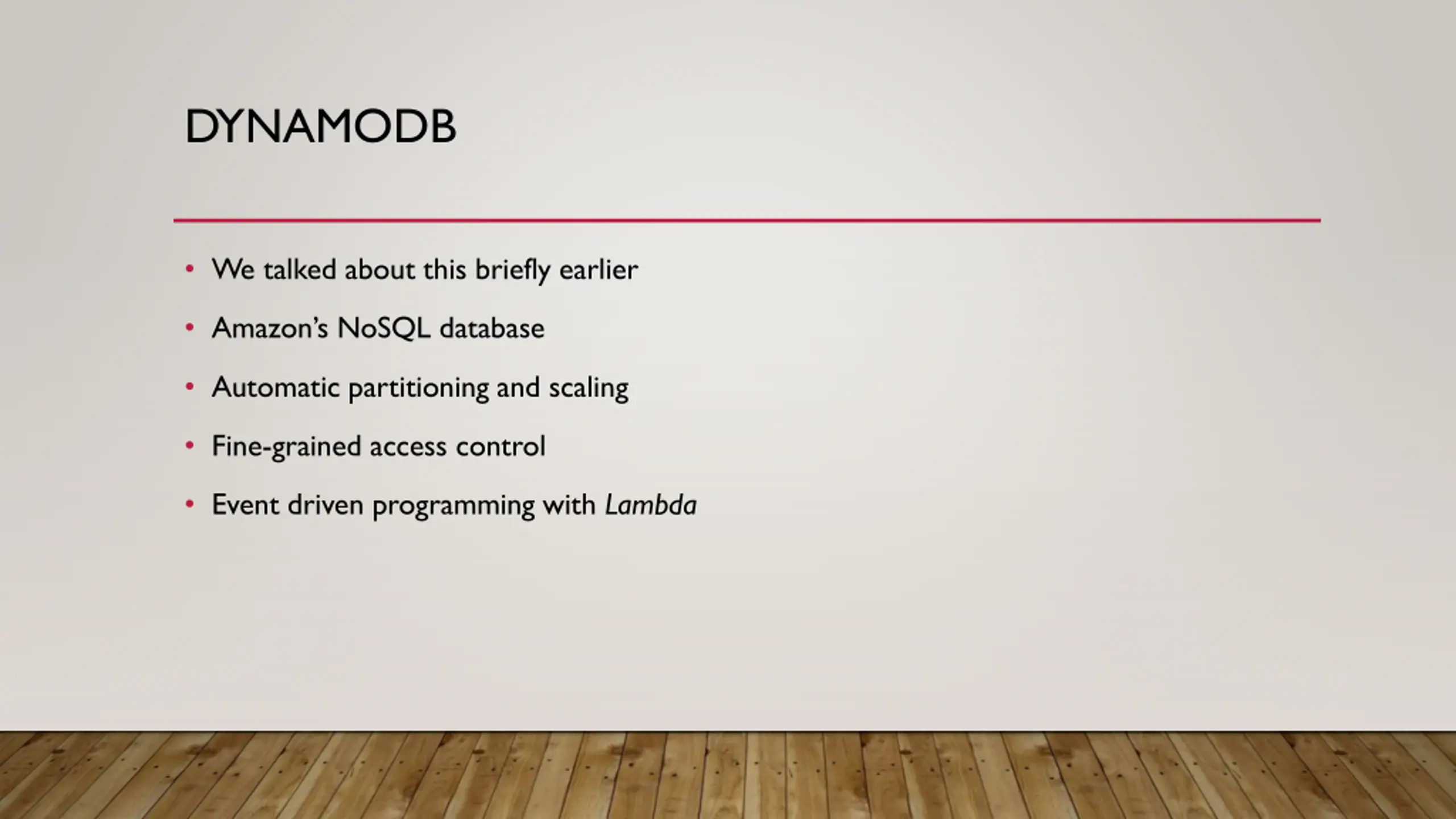 DYNAMODB We talked about this briefly earlier Amazon s NoSQL database Automatic partitioning and scaling Fine-grained access control Event driven programming with Lambda