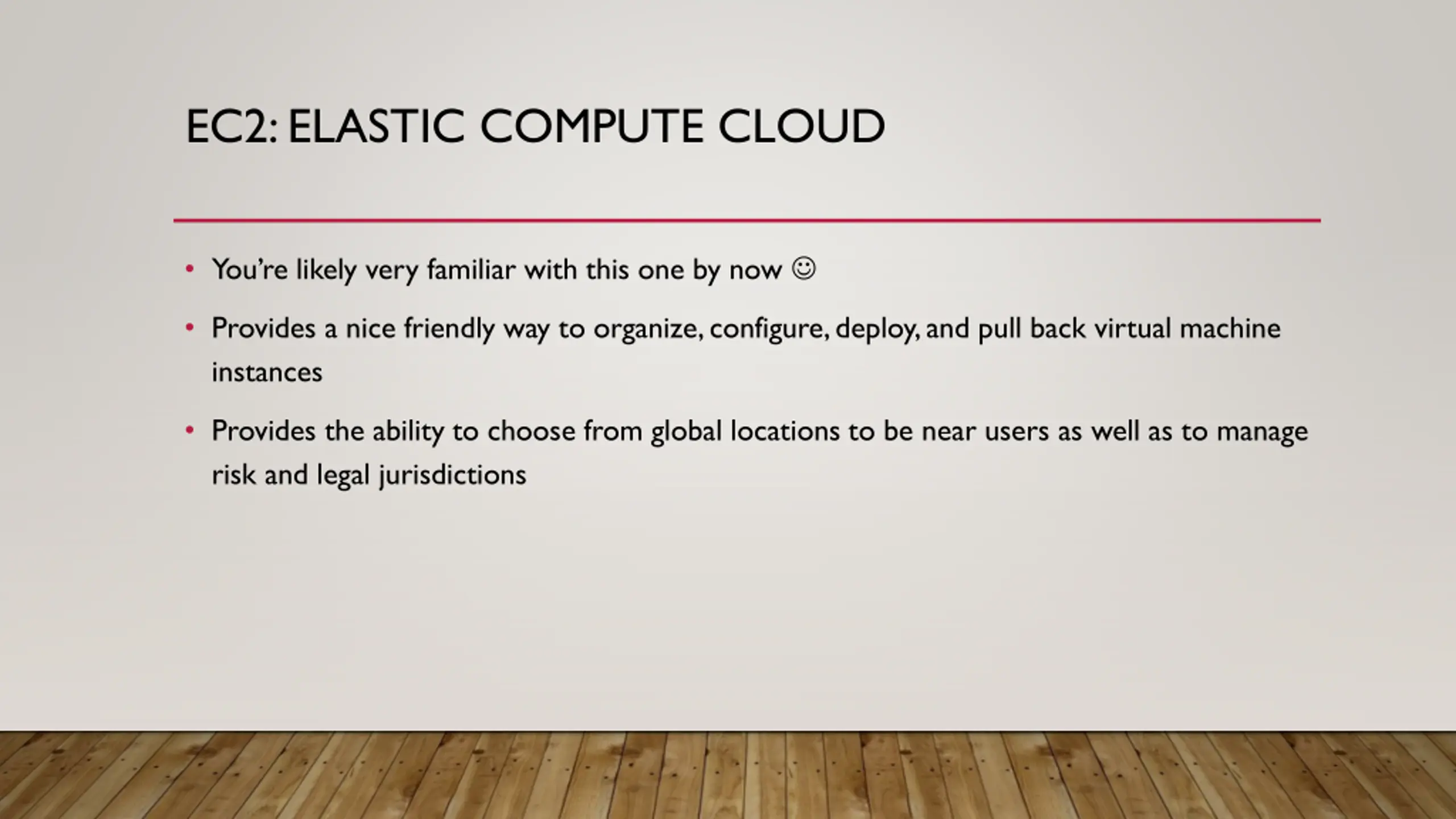 EC2: ELASTIC COMPUTE CLOUD You re likely very familiar with this one by now Provides a nice friendly way to organize, configure, deploy, and pull back virtual machine instances Provides the ability to choose from global locations to be near users as well as to manage risk and legal jurisdictions