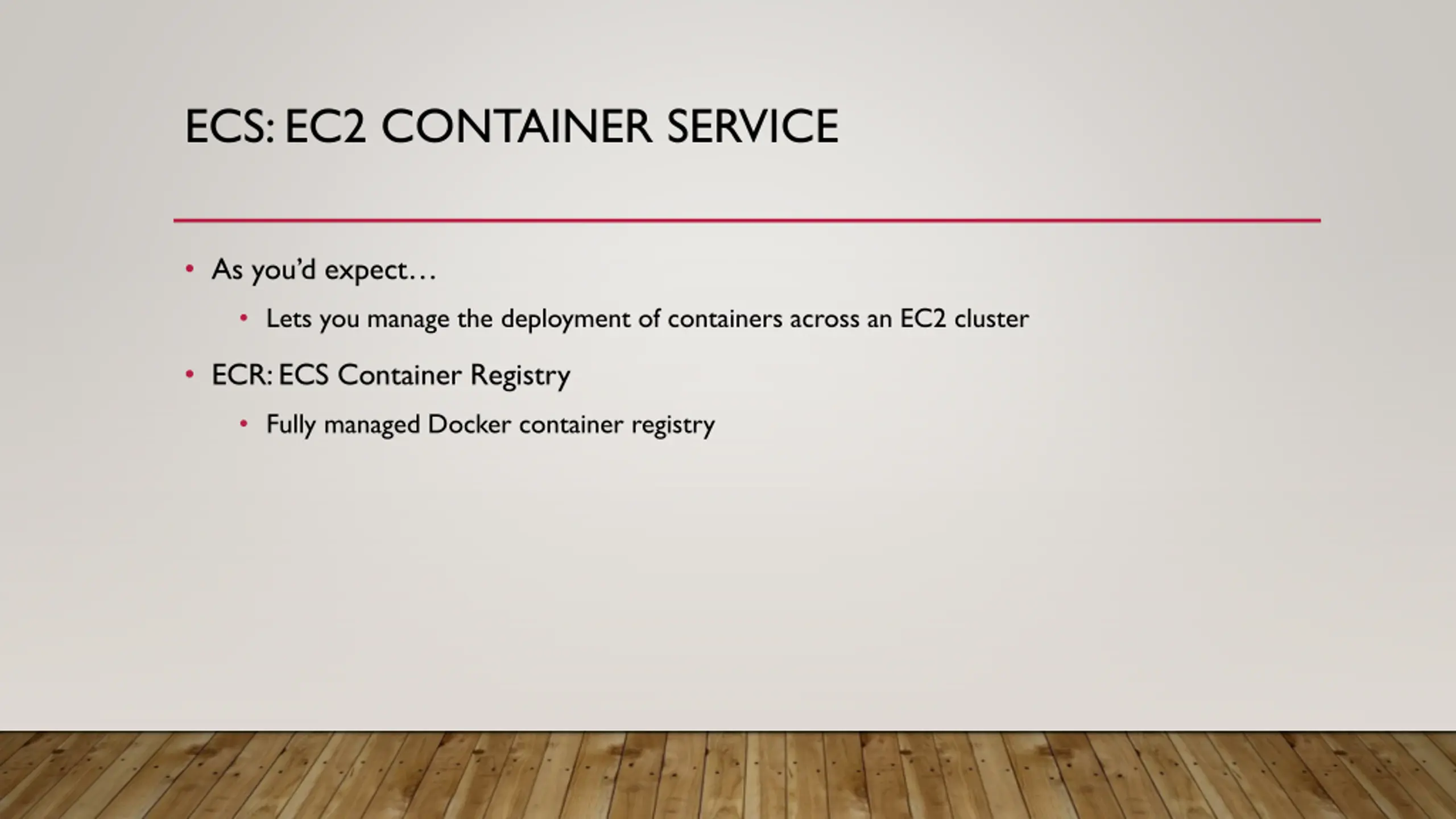 ECS: EC2 CONTAINER SERVICE As you d expect Lets you manage the deployment of containers across an EC2 cluster ECR: ECS Container Registry Fully managed Docker container registry