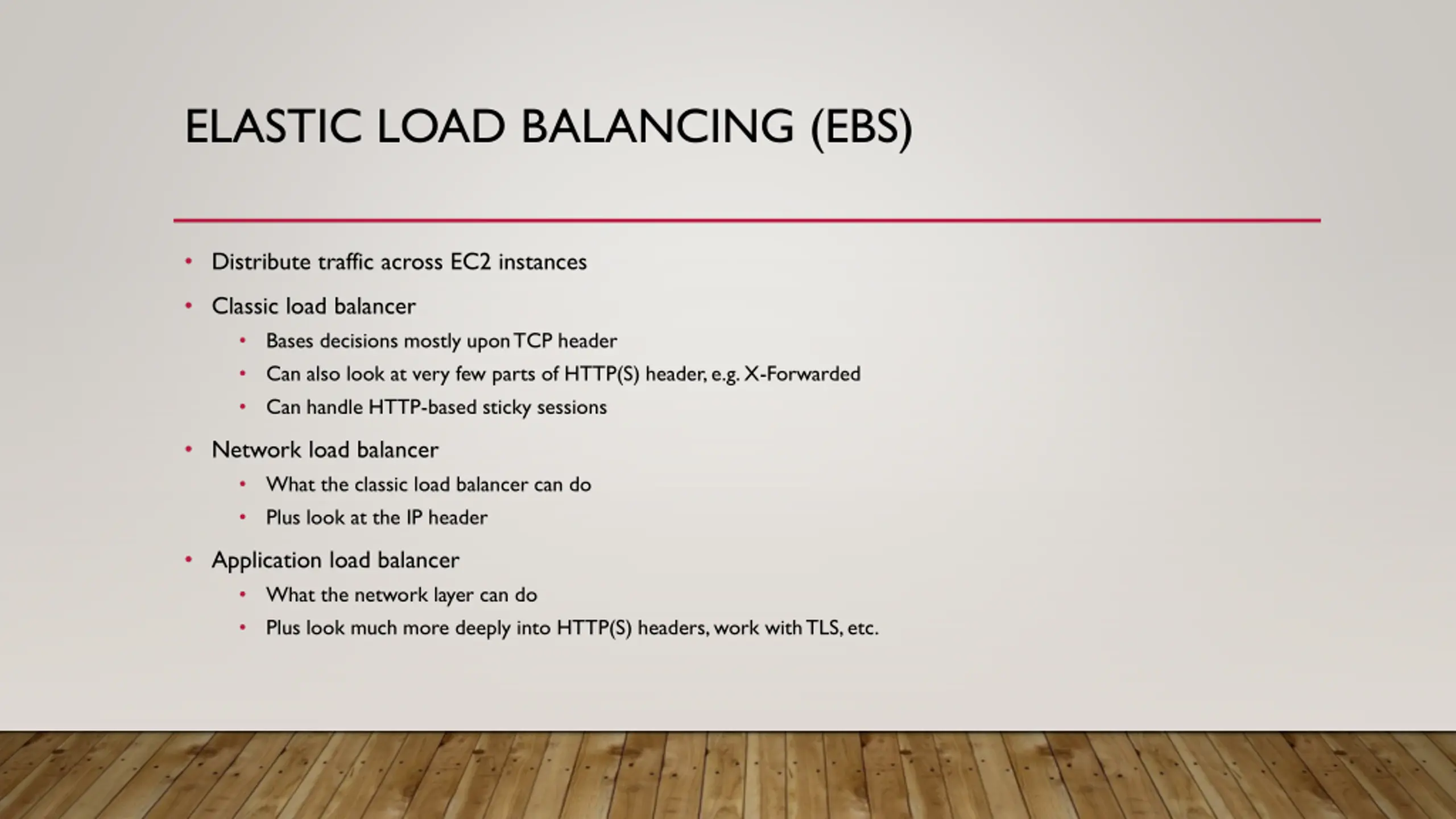 ELASTIC LOAD BALANCING (EBS) Distribute traffic across EC2 instances Classic load balancer Bases decisions mostly upon TCP header Can also look at very few parts of HTTP(S) header, e.g. X-Forwarded Can handle HTTP-based sticky sessions Network load balancer What the classic load balancer can do Plus look at the IP header Application load balancer What the network layer can do Plus look much more deeply into HTTP(S) headers, work with TLS, etc.