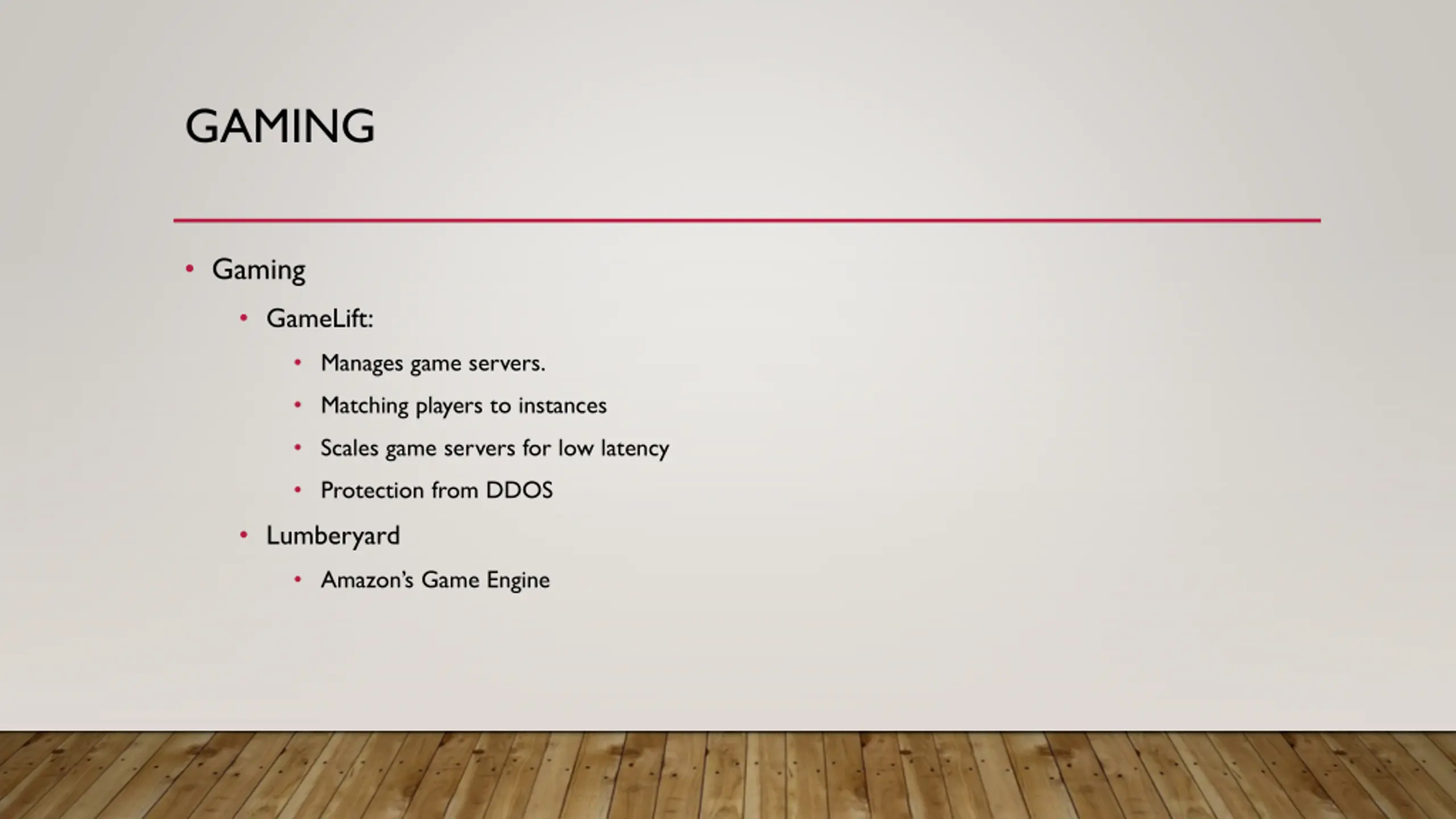 GAMING Gaming GameLift: Manages game servers. Matching players to instances Scales game servers for low latency Protection from DDOS Lumberyard Amazon s Game Engine