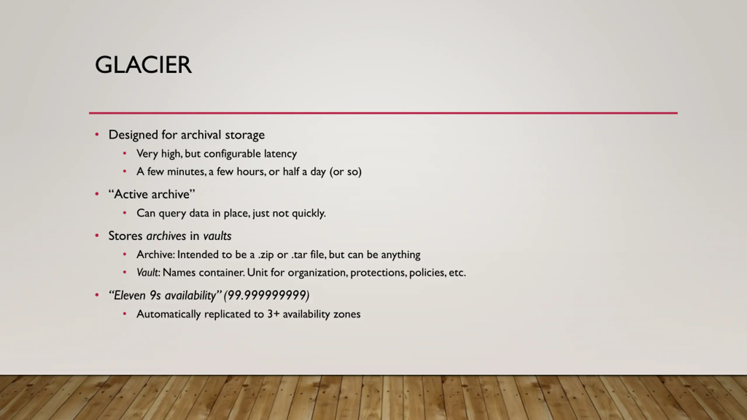 GLACIER Designed for archival storage Very high, but configurable latency A few minutes, a few hours, or half a day (or so) Active archive Can query data in place, just not quickly. Stores archives in vaults Archive: Intended to be a .zip or .tar file, but can be anything Vault: Names container. Unit for organization, protections, policies, etc. Eleven 9s availability (99.999999999) Automatically replicated to 3+ availability zones