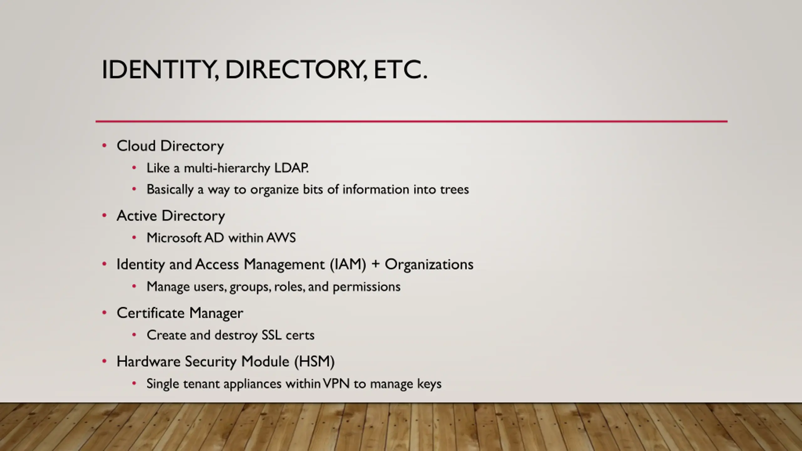 IDENTITY, DIRECTORY, ETC. Cloud Directory Like a multi-hierarchy LDAP. Basically a way to organize bits of information into trees Active Directory Microsoft AD within AWS Identity and Access Management (IAM) + Organizations Manage users, groups, roles, and permissions Certificate Manager Create and destroy SSL certs Hardware Security Module (HSM) Single tenant appliances within VPN to manage keys