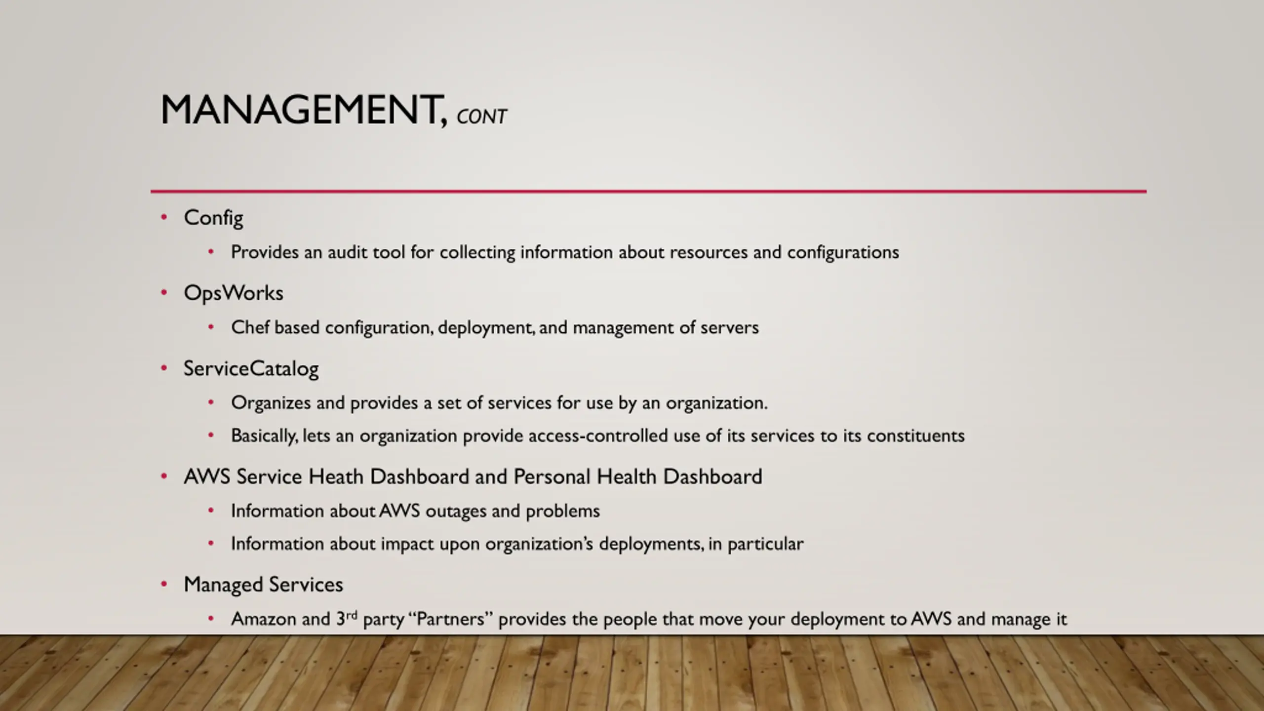 MANAGEMENT, CONT Config Provides an audit tool for collecting information about resources and configurations OpsWorks Chef based configuration, deployment, and management of servers ServiceCatalog Organizes and provides a set of services for use by an organization. Basically, lets an organization provide access-controlled use of its services to its constituents AWS Service Heath Dashboard and Personal Health Dashboard Information about AWS outages and problems Information about impact upon organization s deployments, in particular Managed Services Amazon and 3rdparty Partners provides the people that move your deployment to AWS and manage it