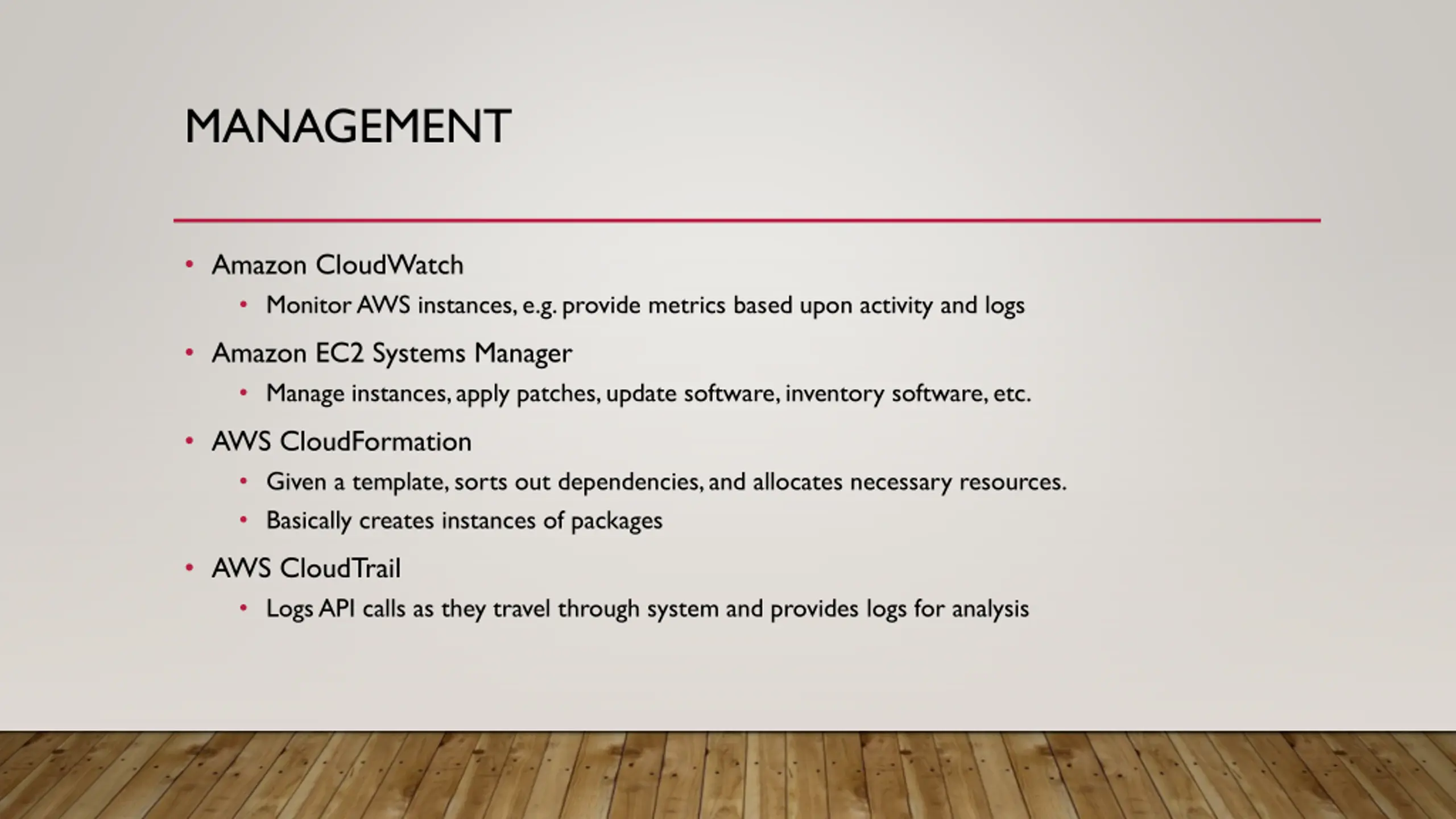 MANAGEMENT Amazon CloudWatch Monitor AWS instances, e.g. provide metrics based upon activity and logs Amazon EC2 Systems Manager Manage instances, apply patches, update software, inventory software, etc. AWS CloudFormation Given a template, sorts out dependencies, and allocates necessary resources. Basically creates instances of packages AWS CloudTrail Logs API calls as they travel through system and provides logs for analysis