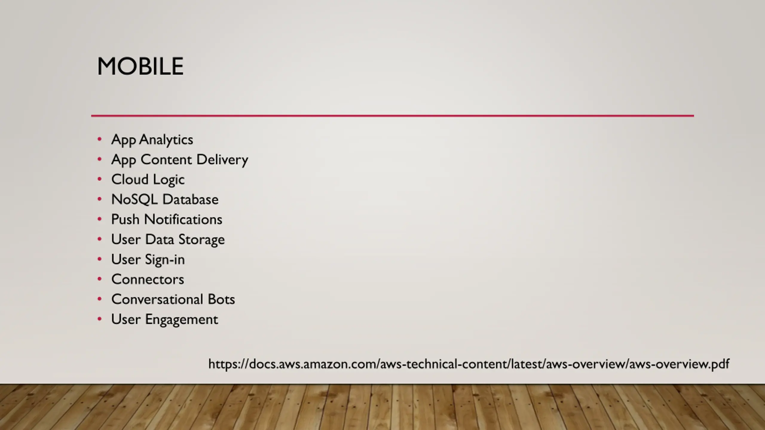 MOBILE App Analytics App Content Delivery Cloud Logic NoSQL Database Push Notifications User Data Storage User Sign-in Connectors Conversational Bots User Engagement https://docs.aws.amazon.com/aws-technical-content/latest/aws-overview/aws-overview.pdf
